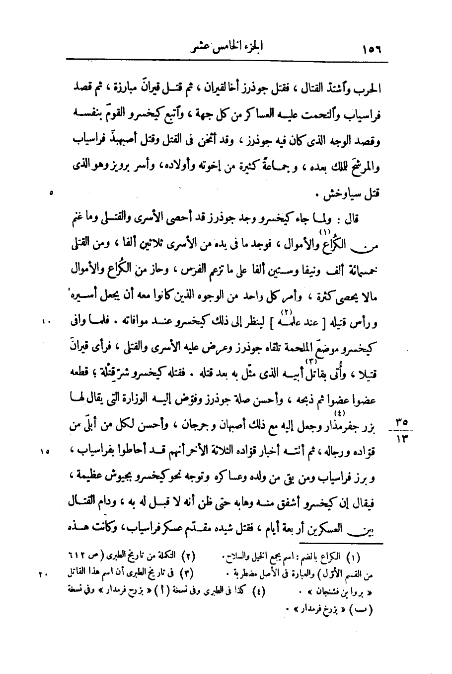 الحرب واشتدّ القتال، فقتل جوذرز أخالقيران، ثم قتل قيران مبارزة، ثم قصد فراسياب والتحمت عليه العساكر من كل جهة، واتبع كيخسرو القوم بنفسه وقصد الوجه الذى كان فيه جوذرز، وقد أثخن فى القتل وقتل أصبهبذ فراسياب والمرشح للملك بعده، وجماعة كثيرة من إخوته وأولاده، وأسر برويز وهو الذى قتل سياوخش.