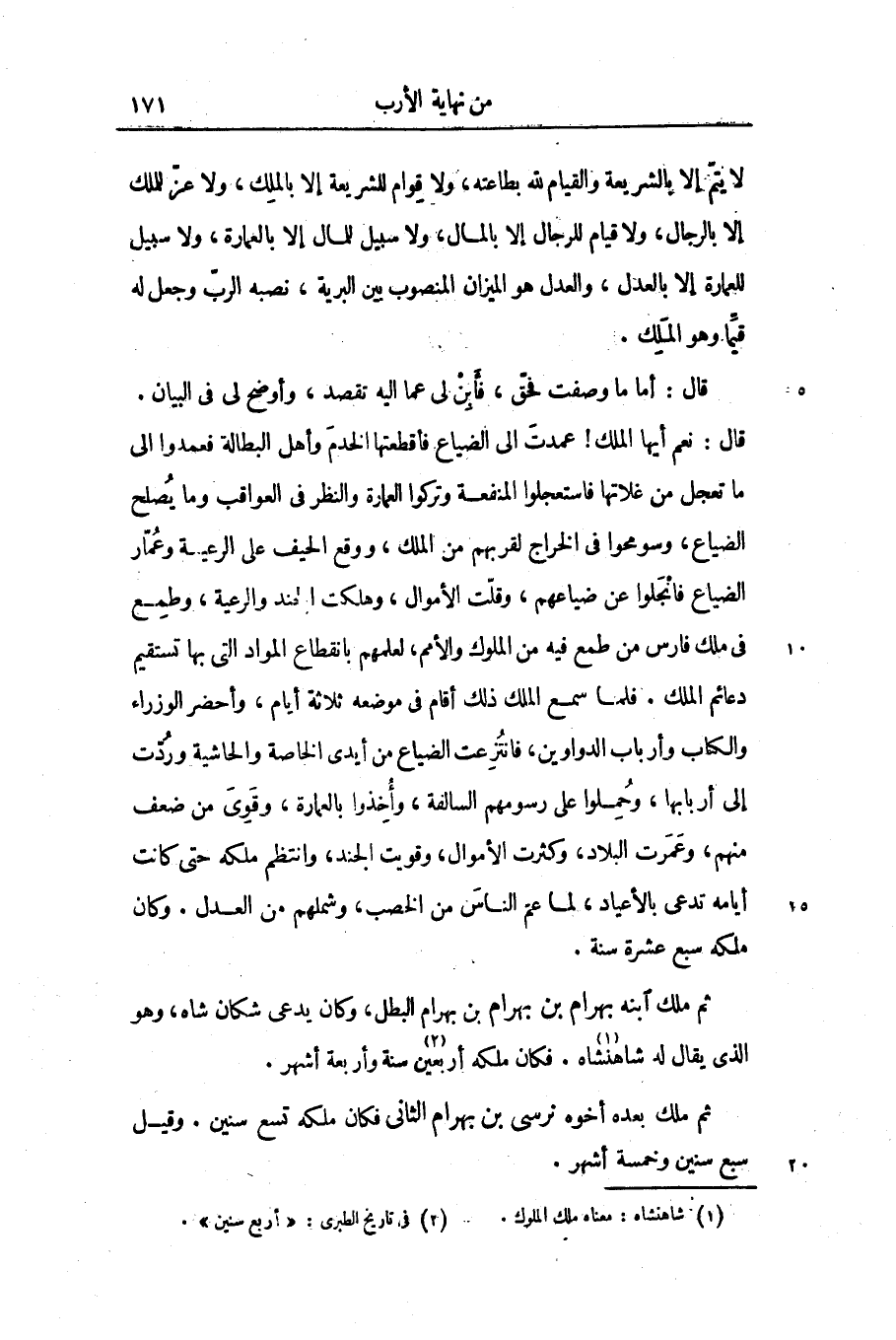 قال: نعم أيها الملك! عمدت الى الضياع فأقطعتها الخدم وأهل البطالة فعمدوا الى ما تعجل من غلاتها فاستعجلوا المنفعة وتركوا العمارة والنظر فى العواقب وما يصلح الضياع، وسومحوا فى الخراج لقربهم من الملك. ووقع الحيف على الرعية وعمّار الضياع فانجلوا عن ضياعهم، وقلّت الأموال، وهلكت الجند والرعية، وطمع فى ملك فارس من طمع فيه من الملوك والأمم، لعلمهم بانقطاع المواد التى بها تستقيم دعائم الملك. فلما سمع الملك ذلك أقام فى موضعه ثلاثة أيام، وأحضر الوزراء والكتاب وأرباب الدواوين، فانتزعت الضياع من أيدى الخاصة والحاشية وردّت إلى أربابها، وحملوا على رسومهم السالفة، وأخذوا بالعمارة، وقوى من ضعف منهم، وعمرت البلاد، وكثرت الأموال، وقويت الجند، وانتظم ملكه حتى كانت أيامه تدعى بالأعياد، لما عمّ الناس من الخصب، وشملهم من العدل. وكان ملكه سبع عشرة سنة.