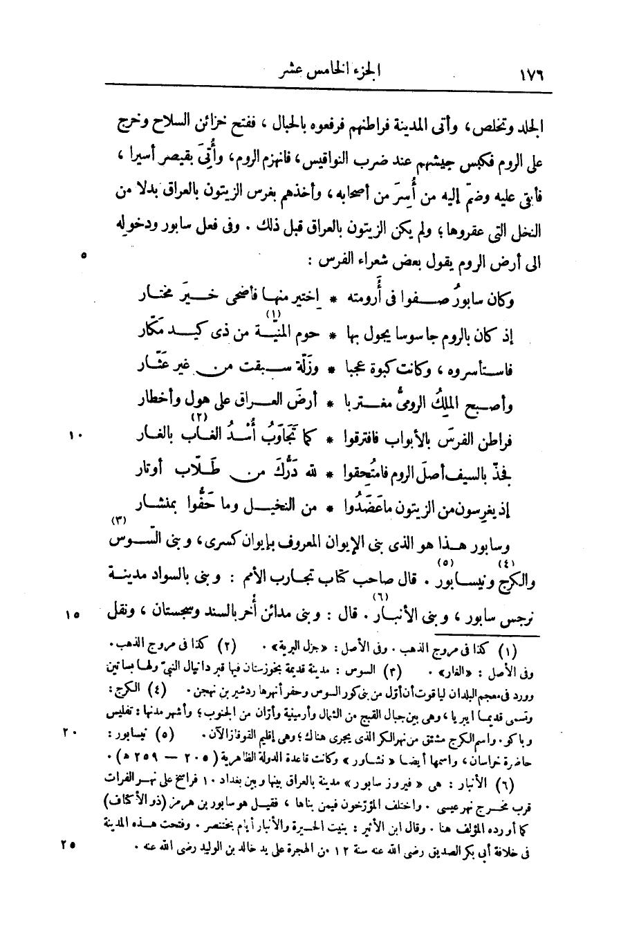 الجلد وتخلص، وأتى المدينة فراطنهم فرفعوه بالحبال، ففتح خزائن السلاح وخرج على الروم فكبس جيشهم عند ضرب النواقيس، فانهزم الروم، وأتى بقيصر أسيرا، فأبقى عليه وضمّ إليه من أسر من أصحابه، وأخذهم بغرس الزيتون بالعراق بدلا من النخل التى عقروها؛ ولم يكن الزيتون بالعراق قبل ذلك. وفى فعل سابور ودخوله الى أرض الروم يقول بعض شعراء الفرس: