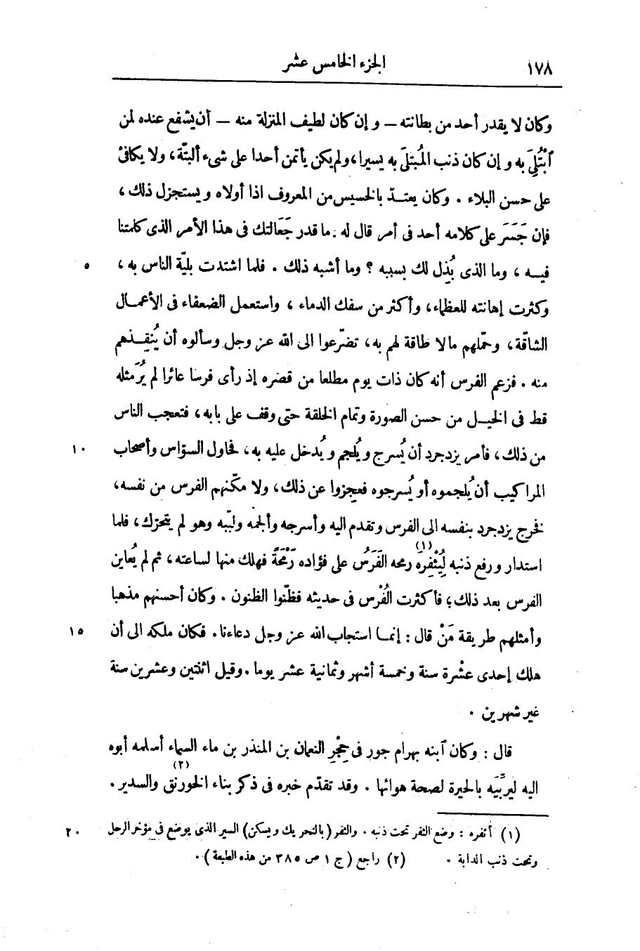 وكان لا يقدر أحد من بطانته- وإن كان لطيف المنزلة منه- أن يشفع عنده لمن ابتلى به وإن كان ذنب المبتلى به يسيرا، ولم يكن يأتمن أحدا على شىء ألبتّة، ولا يكافئ على حسن البلاء. وكان يعتدّ بالخسيس من المعروف اذا أولاه ويستجزل ذلك، فإن جسر على كلامه أحد فى أمر قال له: ما قدر جعالتك فى هذا الأمر الذى كلمتنا فيه، وما الذى بذل لك بسببه؟ وما أشبه ذلك. فلما اشتدت بليّة الناس به، وكثرت إهانته للعظماء، وأكثر من سفك الدماء، واستعمل الضعفاء فى الأعمال الشاقّة، وحمّلهم ما لا طاقة لهم به، تضرّعوا الى الله عز وجل وسألوه أن ينقذهم منه. فزعم الفرس أنه كان ذات يوم مطلعا من قصره إذ رأى فرسا عائرا لم ير مثله قط فى الخيل من حسن الصورة وتمام الخلقة حتى وقف على بابه، فتعجب الناس من ذلك، فأمر يزدجرد أن يسرج ويلجم ويدخل عليه به، فحاول السوّاس وأصحاب المراكيب أن يلجموه أو يسرجوه فعجزوا عن ذلك، ولا مكّنهم الفرس من نفسه، فخرج يزدجرد بنفسه الى الفرس وتقدم اليه وأسرجه وألجمه ولبّبه وهو لم يتحرّك، فلما استدار ورفع ذنبه ليثفره «1» رمحه الفرس على فؤاده رمحة فهلك منها لساعته، ثم لم يعاين الفرس بعد ذلك؛ فأكثرت الفرس فى حديثه فظنّوا الظنون. وكان أحسنهم مذهبا وأمثلهم طريقة من قال: إنما استجاب الله عز وجل دعاءنا. فكان ملكه الى أن هلك إحدى عشرة سنة وخمسة أشهر وثمانية عشر يوما. وقيل اثنتين وعشرين سنة غير شهرين.