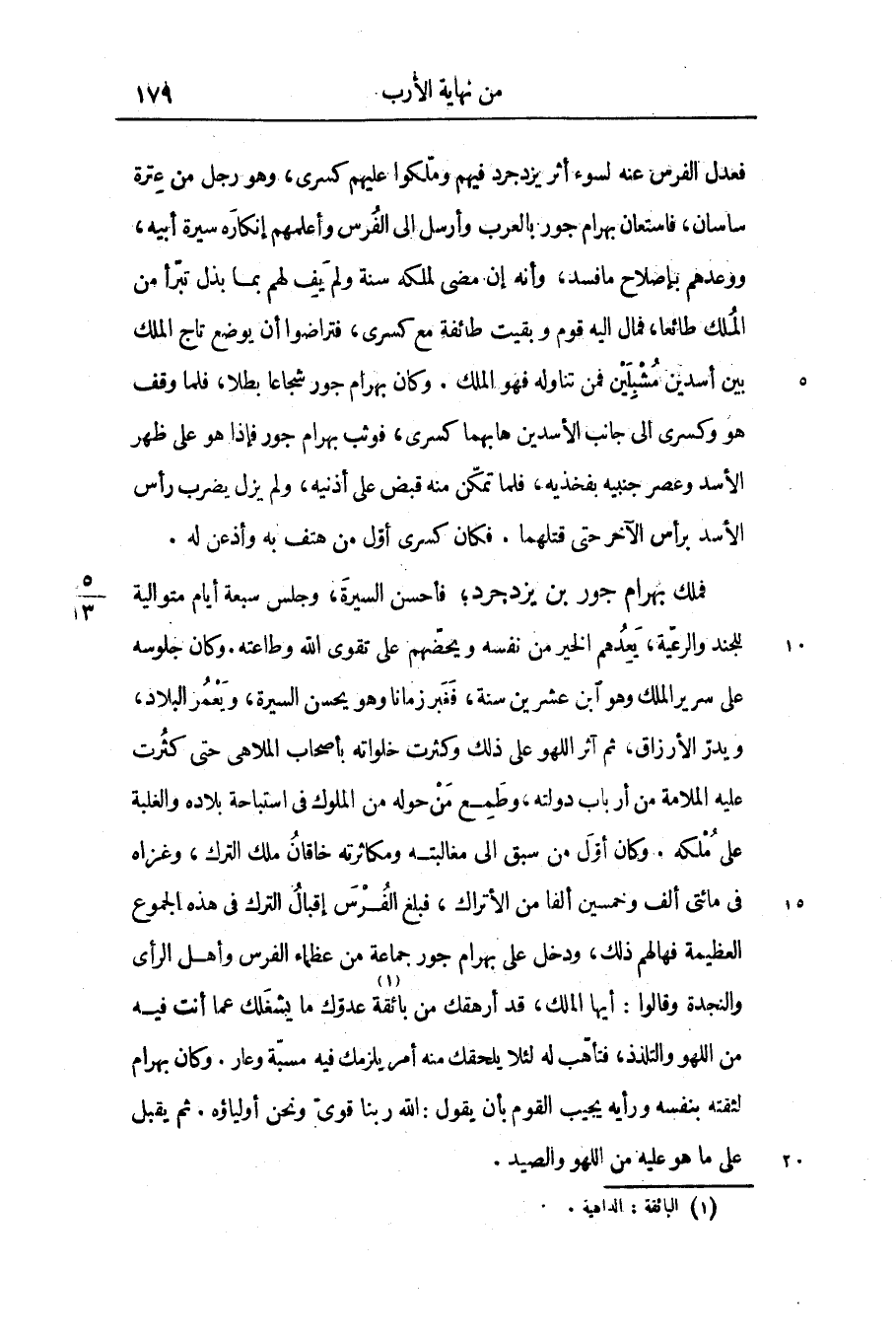 فملك بهرام جور بن يزدجرد؛ فأحسن السيرة، وجلس سبعة أيام متوالية للجند والرعيّة، يعدهم الخير من نفسه ويحضّهم على تقوى الله وطاعته. وكان جلوسه على سرير الملك وهو ابن عشرين سنة، فغبر زمانا وهو يحسن السيرة، ويعمر البلاد، ويدرّ الأرزاق، ثم آثر اللهو على ذلك وكثرت خلواته بأصحاب الملاهى حتى كثرت عليه الملامة من أرباب دولته، وطمع من حوله من الملوك فى استباحة بلاده والغلبة على ملكه. وكان أوّل من سبق الى مغالبته ومكاثرته خاقان ملك الترك، وغزاه فى مائتى ألف وخمسين ألفا من الأتراك، فبلغ الفرس إقبال الترك فى هذه الجموع العظيمة فهالهم ذلك، ودخل على بهرام جور جماعة من عظماء الفرس وأهل الرأى والنجدة وقالوا: أيها الملك، قد أرهقك من بائقة «1» عدوّك ما يشغلك عما أنت فيه من اللهو والتلذذ، فتأهّب له لئلا يلحقك منه أمر يلزمك فيه مسبّة وعار. وكان بهرام لثقته بنفسه ورأيه يجيب القوم بأن يقول: الله ربنا قوىّ ونحن أولياؤه. ثم يقبل على ما هو عليه من اللهو والصيد.