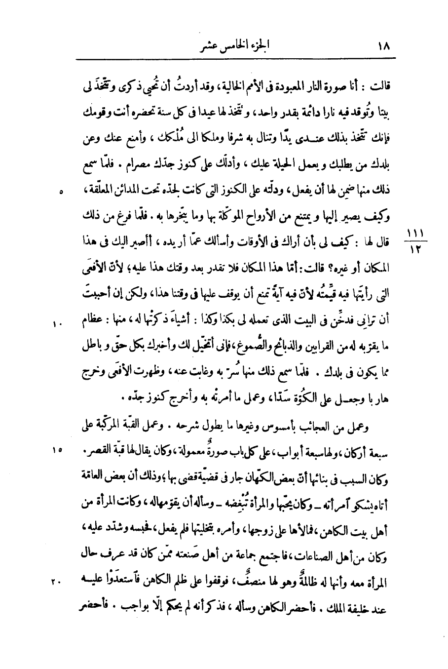 قالت: أنا صورة النار المعبودة فى الأمم الخالية، وقد أردت أن تحيى ذكرى وتتّخذلى بيتا وتوقد فيه نارا دائمة بقدر واحد، وتتّخذ لها عيدا فى كل سنة تحضره أنت وقومك فإنك تتّخذ بذلك عندى يدا وتنال به شرفا وملكا الى ملكك، وأمنع عنك وعن بلدك من يطلبك ويعمل الحيلة عليك، وأدلك على كنوز جدّك مصرام. فلمّا سمع ذلك منها ضمن لها أن يفعل، ودلّته على الكنوز التى كانت لجدّه تحت المدائن المعلّقة، وكيف يصير إليها ويمتنع من الأرواح الموكّلة بها وما يبخّرها به. فلمّا فرغ من ذلك قال لها: كيف لى بأن أراك فى الأوقات وأسألك عمّا أريده، أأصير اليك فى هذا المكان أو غيره؟ قالت: أمّا هذا المكان فلا تقدر بعد وقتك هذا عليه؛ لأنّ الأفعى التى رأيتها فيه قيّمته لأنّ فيه آية تمنع أن يوقف عليها فى وقتنا هذا، ولكن إن أحببت أن ترانى فدخّن فى البيت الذى تعمله لى بكذا وكذا: أشياء ذكرتها له، منها: عظام ما يقرّبه له من القرابين والذبائح والصّموغ، فإنى أتخيّل لك وأخبرك بكل حقّ وباطل مما يكون فى بلدك. فلمّا سمع ذلك منها سرّ به وغابت عنه، وظهرت الأفعى وخرج هاربا وجعل على الكوّة سدّا، وعمل ما أمرته به وأخرج كنوز جدّه.