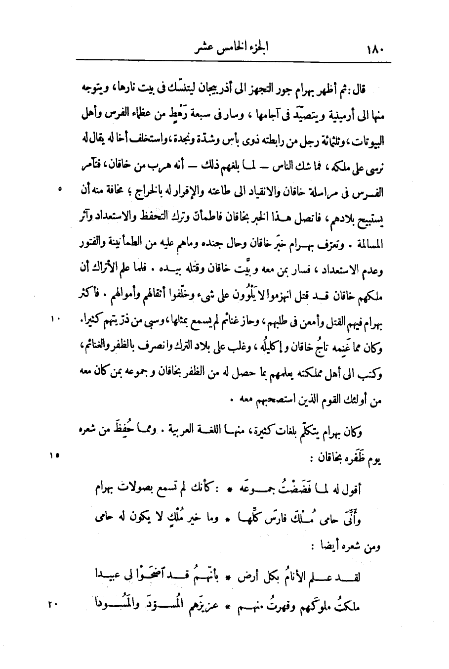 قال: ثم أظهر بهرام جور التجهز الى أذربيجان ليتنسّك فى بيت نارها، ويتوجه منها الى أرمينية ويتصيد فى آجامها، وسار فى سبعة رهط من عظماء الفرس وأهل البيوتات، وثلاثمائة رجل من رابطته ذوى بأس وشدّة ونجدة، واستخلف أخاله يقال له نرسى على ملكه، فما شك الناس- لما بلغهم ذلك- أنه هرب من خاقان، فتآمر الفرس فى مراسلة خاقان والانقياد الى طاعته والإقرار له بالخراج؛ مخافة منه أن يستبيح بلادهم، فاتصل هذا الخبر بخاقان فاطمأنّ وترك التحفظ والاستعداد وآثر المسالمة. وتعرّف بهرام خبر خاقان وحال جنده وما هم عليه من الطمأنينة والفتور وعدم الاستعداد، فسار بمن معه وبيّت خاقان وقتله بيده. فلما علم الأتراك أن ملكهم خاقان قد قتل انهزموا لا يلوون على شىء وخلّفوا أثقالهم وأموالهم. فأكثر بهرام فيهم القتل وأمعن فى طلبهم، وحاز غنائم لم يسمع بمثلها، وسبى من ذرّيتهم كثيرا.
