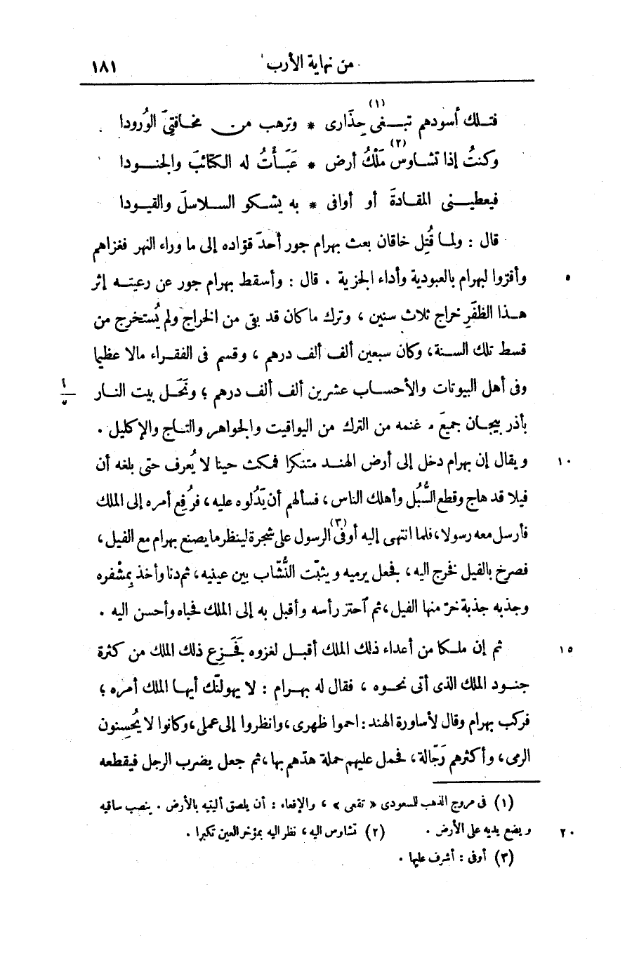 ويقال إن بهرام دخل إلى أرض الهند متنكرا فمكث حينا لا يعرف حتى بلغه أن فيلا قد هاج وقطع السّبل وأهلك الناس، فسألهم أن يدلوه عليه، فرفع أمره إلى الملك فأرسل معه رسولا، فلما انتهى إليه أوفى «3» الرسول على شجرة لينظر ما يصنع بهرام مع الفيل، فصرخ بالفيل فخرج اليه، فجعل يرميه ويثبّت النّشّاب بين عينيه، ثم دنا وأخذ بمشفره وجذبه جذبة خرّمنها الفيل، ثم احتز رأسه وأقبل به إلى الملك فحباه وأحسن اليه.