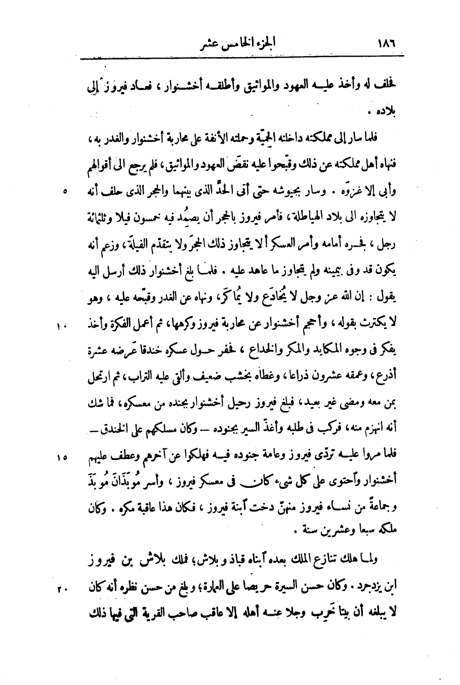 فلما سار إلى مملكته داخلته الحميّة وحملته الأنفة على محاربة أخشنوار والغدر به، فنهاه أهل مملكته عن ذلك وقبّحوا عليه نقض العهود والمواثيق، فلم يرجع الى أقوالهم وأبى إلا غزوه. وسار بجيوشه حتى أتى الحدّ الذى بينهما والحجر الذى حلف أنه لا يتجاوزه الى بلاد الهياطلة، فأمر فيروز بالحجر أن يصمد فيه خمسون فيلا وثلاثمائة رجل، فجره أمامه وأمر العسكر ألا يتجاوز ذلك الحجر ولا يتقدّم الفيلة، وزعم أنه يكون قد وفى بيمينه ولم يتجاوز ما عاهد عليه. فلما بلغ أخشنوار ذلك أرسل اليه يقول: إن الله عز وجل لا يخادع ولا يماكر، ونهاه عن الغدر وقبّحه عليه، وهو لا يكترث بقوله، وأحجم أخشنوار عن محاربة فيروز وكرهها، ثم أعمل الفكرة وأخذ يفكر فى وجوه المكايد والمكر والخداع، فخفر حول عسكره خندقا عرضه عشرة أذرع، وعمقه عشرون ذراعا، وغطاه بخشب ضعيف وألقى عليه التراب، ثم ارتحل بمن معه ومضى غير بعيد، فبلغ فيروز رحيل أخشنوار بجنده من معسكره، فما شك أنه انهزم منه، فركب فى طلبه وأغذّ السير بجنوده- وكان مسلكهم على الخندق- فلما مروا عليه تردّى فيروز وعامة جنوده فيه فهلكوا عن آخرهم وعطف عليهم أخشنوار واحتوى على كل شىء كان فى معسكر فيروز، وأسر موبذان موبذ وجماعة من نساء فيروز منهنّ دخت ابنة فيروز، فكان هذا عاقبة مكره. وكان ملكه سبعا وعشرين سنة.