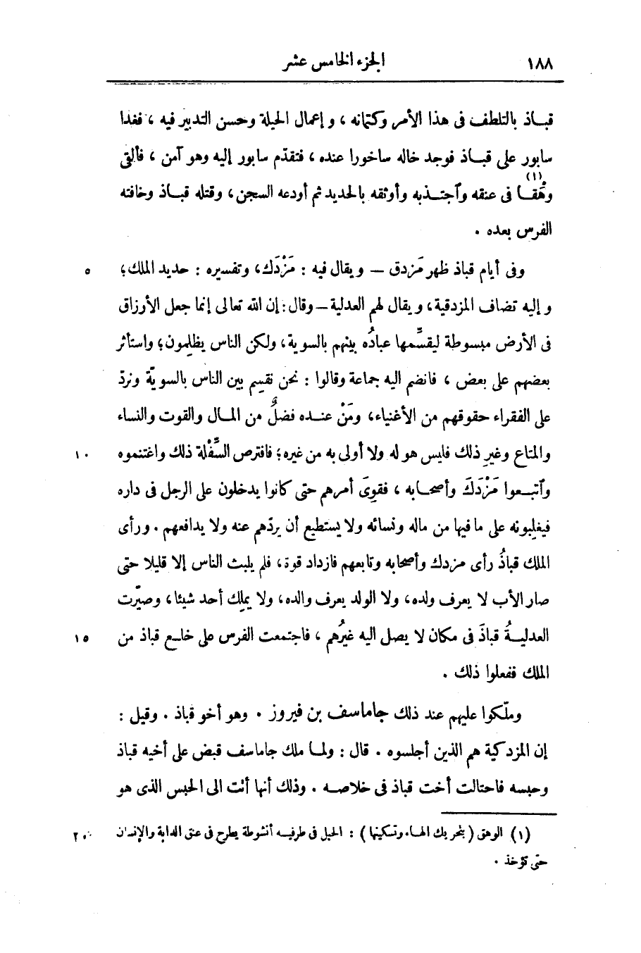 وفى أيام قباذ ظهر مزدق- ويقال فيه: مزدك، وتفسيره: حديد الملك؛ وإليه تضاف المزدقية، ويقال لهم العدلية- وقال: إن الله تعالى إنما جعل الأرزاق فى الأرض مبسوطة ليقسّمها عباده بينهم بالسوية، ولكن الناس يظلمون؛ واستأثر بعضهم على بعض، فانضم اليه جماعة وقالوا: نحن نقسم بين الناس بالسويّة ونردّ على الفقراء حقوقهم من الأغنياء، ومن عنده فضل من المال والقوت والنساء والمتاع وغير ذلك فليس هو له ولا أولى به من غيره؛ فافترص السّفلة ذلك واغتنموه واتبعوا مزدك وأصحابه، فقوى أمرهم حتى كانوا يدخلون على الرجل فى داره فيغلبونه على ما فيها من ماله ونسائه ولا يستطيع أن يردّهم عنه ولا يدافعهم. ورأى الملك قباذ رأى مزدك وأصحابه وتابعهم فازداد قوة، فلم يلبث الناس إلا قليلا حتى صار الأب لا يعرف ولده، ولا الولد يعرف والده، ولا يملك أحد شيئا، وصيّرت العدلية قباذ فى مكان لا يصل اليه غيرهم، فاجتمعت الفرس على خلع قباذ من الملك ففعلوا ذلك.