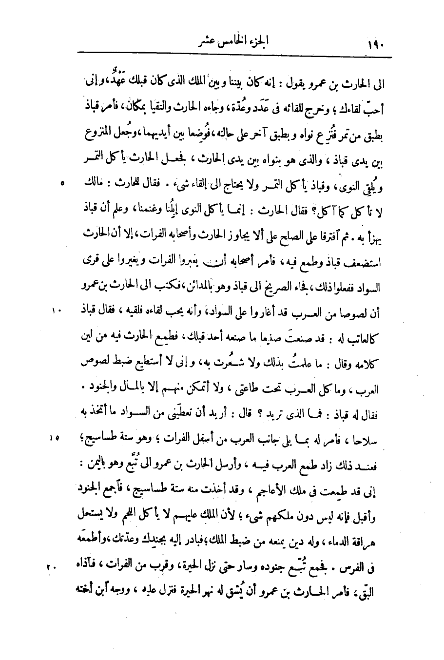 الى الحارث بن عمرو يقول: إنه كان بيننا وبين الملك الذى كان قبلك عهد، وإنى أحبّ لقاءك؛ وخرج للقائه فى عدد وعدّة، وجاءه الحارث والتقيا بمكان، فأمر قباذ بطبق من تمر فنزع نواه وبطبق آخر على حالته، فوضعا بين أيديهما، وجعل المنزوع بين يدى قباذ، والذى هو بنواه بين يدى الحارث، فجعل الحارث يأكل التمر ويلقى النوى، وقباذ يأكل التمر ولا يحتاج الى إلقاء شىء. فقال للحارث: مالك لا تأكل كما آكل؟ فقال الحارث: إنما يأكل النوى إبلنا وغنمنا، وعلم أن قباذ يهزأ به. ثم افترقا على الصلح على ألا يجاوز الحارث وأصحابه الفرات، إلا أن الحارث استضعف قباذ وطمع فيه، فأمر أصحابه أن يغبروا الفرات ويغيروا على قرى السواد ففعلوا ذلك، فجاء الصريخ الى قباذ وهو بالمدائن، فكتب الى الحارث بن عمرو أن لصوصا من العرب قد أغاروا على السواد، وأنه يحب لقاءه فلقيه، فقال قباذ كالعاتب له: قد صنعت صنيعا ما صنعه أحد قبلك، فطمع الحارث فيه من لين كلامه وقال: ما علمت بذلك ولا شعرت به، وإنى لا أستطيع ضبط لصوص العرب، وما كل العرب تحت طاعتى، ولا أتمكن منهم إلا بالمال والجنود.