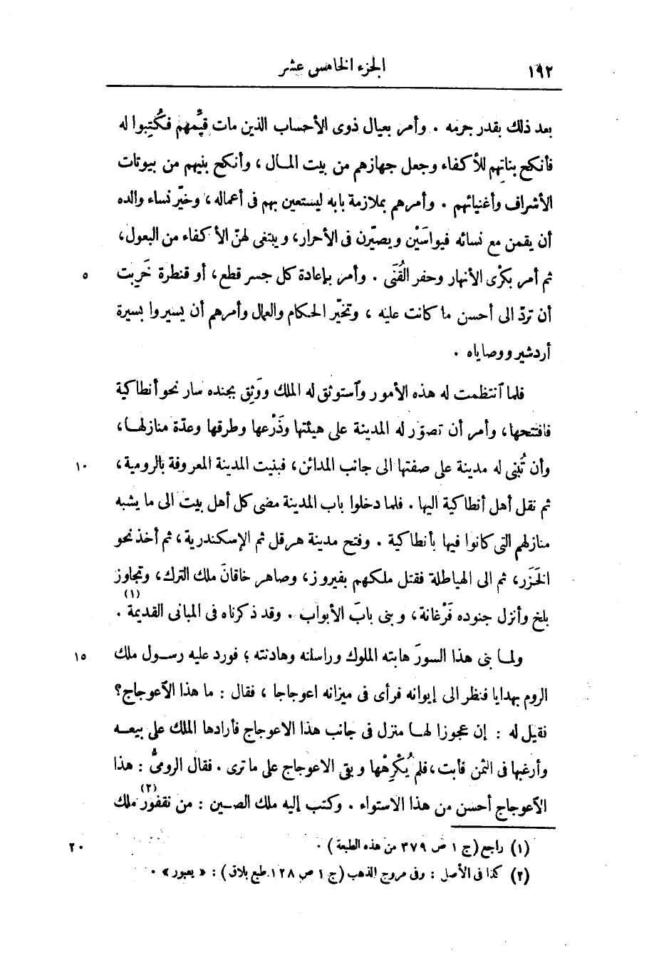 فقيل له: إن عجوزا لها منزل فى جانب هذا الاعوجاج فأرادها الملك على بيعه وأرغبها فى الثمن فأبت، فلم يكرهها وبقى الاعوجاج على ما ترى. فقال الرومىّ: هذا الاعوجاج أحسن من هذا الاستواء. وكتب إليه ملك الصين: من نقفور «2» ملك