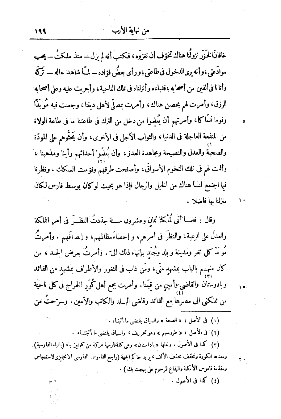 وقال: فلما أتى لملكنا ثمان وعشرون سنة جدّدت النظر فى أمر المملكة والعدل على الرعية، والنظر فى أمرهم، وإحصاء مظالمهم، وإنصافهم. وأمرت موبذ كل ثغر ومدينة وبلد وجند بإنهاء ذلك الىّ. وأمرت بعرض الجند، من كان منهم بالباب بمشهد منّى، ومن غاب فى الثغور والأطراف بمشهد من القائد وبادوستان «3» والقاضى وأمين من قبلنا. وأمرت بجمع أهل كور الخراج فى كل ناحية من مملكتى الى مصرها «4» مع القائد وقاضى البلد والكاتب والأمين. وسرّحت من