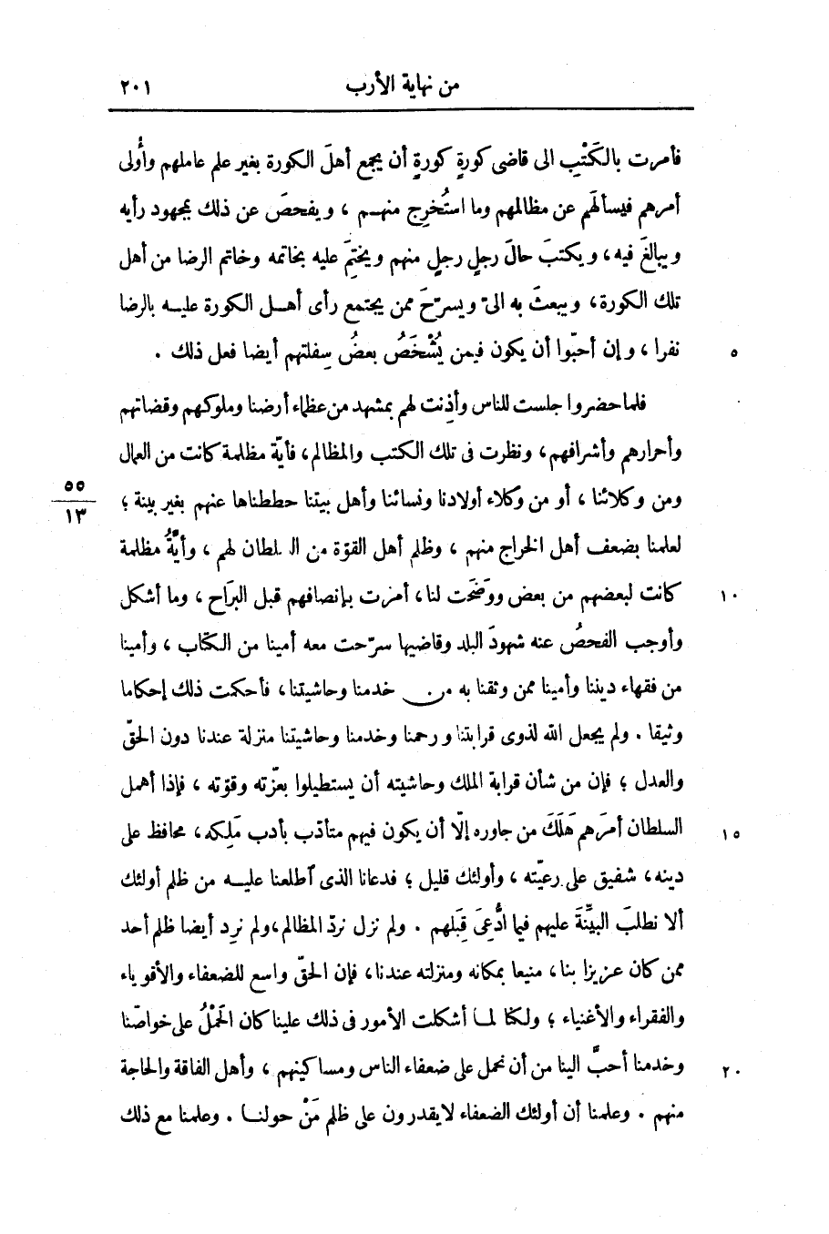 فلما حضروا جلست للناس وأذنت لهم بمشهد من عظماء أرضنا وملوكهم وقضاتهم وأحرارهم وأشرافهم، ونظرت فى تلك الكتب والمظالم، فأيّة مظلمة كانت من العمال ومن وكلائنا، أو من وكلاء أولادنا ونسائنا وأهل بيتنا حططناها عنهم بغير بينة؛ لعلمنا بضعف أهل الخراج منهم، وظلم أهل القوّة من السلطان لهم، وأيّة مظلمة كانت لبعضهم من بعض ووضحت لنا، أمرت بإنصافهم قبل البراح، وما أشكل وأوجب الفحص عنه شهود البلد وقاضيها سرّحت معه أمينا من الكتاب، وأمينا من فقهاء ديننا وأمينا ممن وثقنا به من خدمنا وحاشيتنا، فأحكمت ذلك إحكاما وثيقا. ولم يجعل الله لذوى قرابتنا ورحمنا وخدمنا وحاشيتنا منزلة عندنا دون الحقّ والعدل؛ فإن من شأن قرابة الملك وحاشيته أن يستطيلوا بعزّته وقوّته، فإذا أهمل السلطان أمرهم هلك من جاوره إلّا أن يكون فيهم متأدّب بأدب ملكه، محافظ على دينه، شفيق على رعيّته، وأولئك قليل؛ فدعانا الذى اطلعنا عليه من ظلم أولئك ألا نطلب البيّنة عليهم فيما ادّعى قبلهم. ولم نزل نردّ المظالم، ولم نرد أيضا ظلم أحد ممن كان عزيزا بنا، منيعا بمكانه ومنزلته عندنا، فإن الحقّ واسع للضعفاء والأقوياء والفقراء والأغنياء؛ ولكنا لما أشكلت الأمور فى ذلك علينا كان الحمل على خواصّنا وخدمنا أحبّ الينا من أن نحمل على ضعفاء الناس ومساكينهم، وأهل الفاقة والحاجة منهم. وعلمنا أن أولئك الضعفاء لا يقدرون على ظلم من حولنا. وعلمنا مع ذلك