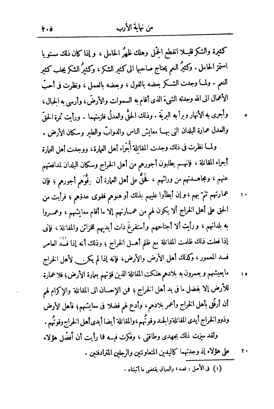 كثيرة والشكر قليلا انقطع الحمل وهلك ظهر الحامل، وإذا كان ذلك مستويا استمرّ الحامل. وكثير النعم يحتاج صاحبها الى كثير الشكر، وكثير الشكر يجلب كثير النعم. ولما وجدت الشكر بعضه بالقول، وبعضه بالعمل، ونظرت فى أحبّ الأعمال الى الله وجدته الشىء الذى أقام به السموات والأرض، وأرسى به الجبال، وأجرى به الأنهار وبرأ به البريّة. وذلك الحقّ والعدل فلزمتهما. ورأيت ثمرة الحقّ والعدل عمارة البلدان التى بها معايش الناس والدوابّ والطير وسكان الأرض.
