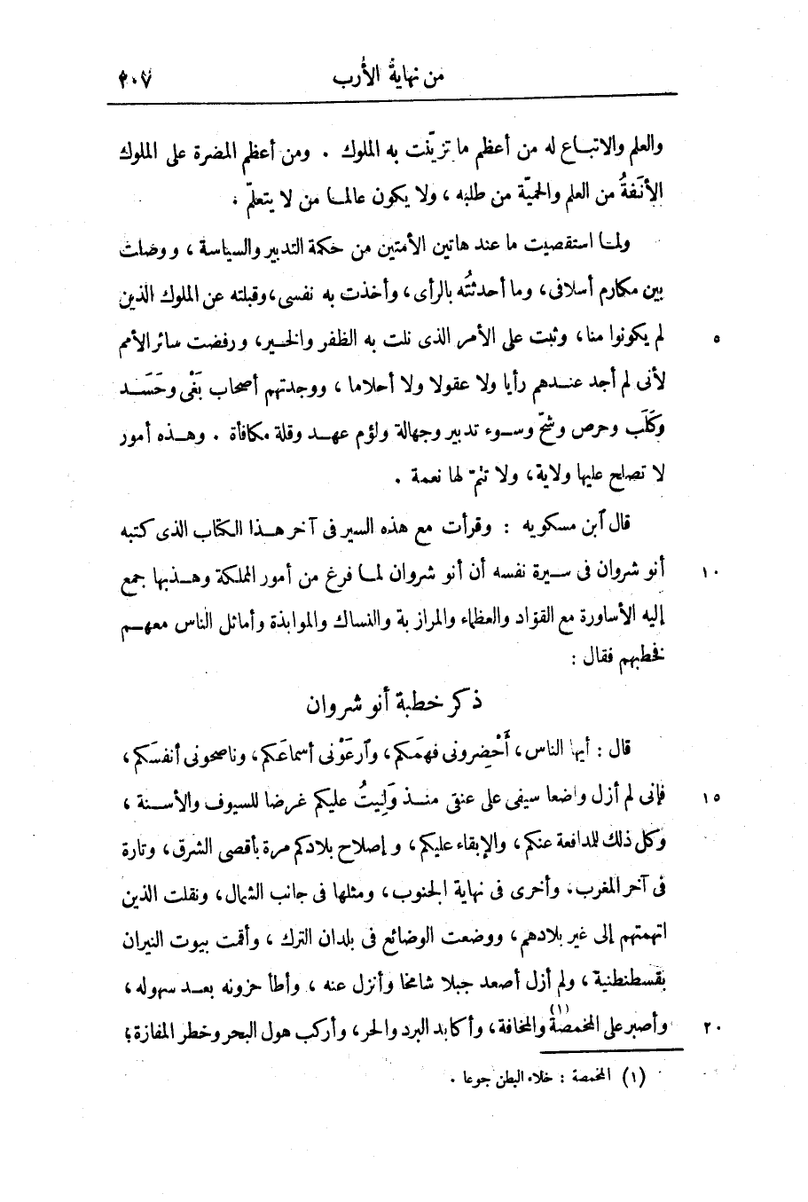 قال ابن مسكويه: وقرأت مع هذه السير فى آخر هذه الكتاب الذى كتبه أنوشروان فى سيرة نفسه أن أنوشروان لما فرغ من أمور المملكة وهذبها جمع إليه الأساورة مع القوّاد والعظماء والمرازبة والنساك والموابذة وأماثل الناس معهم فخطبهم فقال: