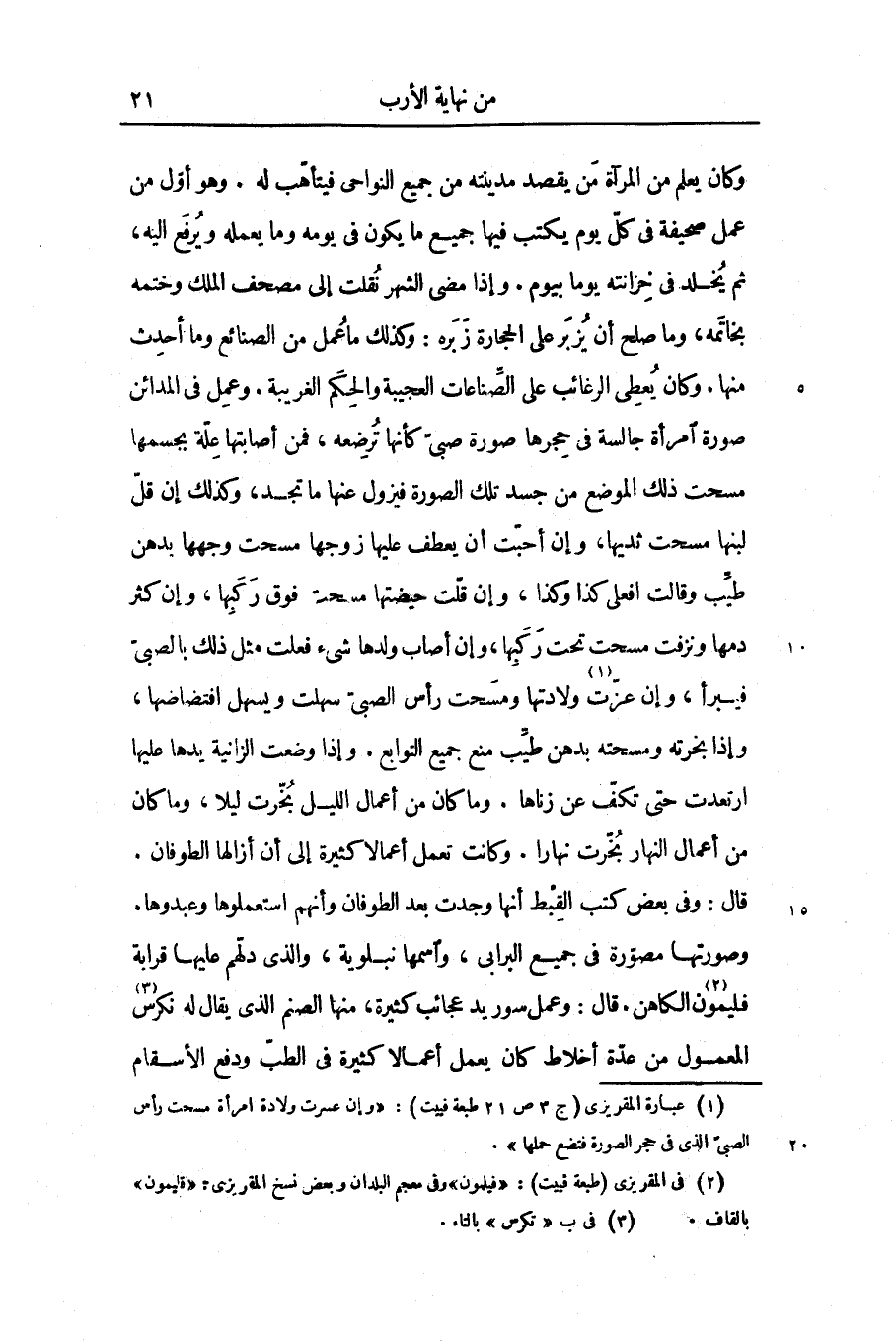 وكان يعلم من المرآة من يقصد مدينته من جميع النواحى فيتأهّب له. وهو أوّل من عمل صحيفة فى كلّ يوم يكتب فيها جميع ما يكون فى يومه وما يعمله ويرفع اليه، ثم يخلد فى خزانته يوما بيوم. وإذا مضى الشهر نقلت إلى مصحف الملك وختمه بخاتمه، وما صلح أن يزبر على الحجارة زبره: وكذلك ما عمل من الصنائع وما أحدث منها. وكان يعطى الرغائب على الصّناعات العجيبة والحكم الغريبة. وعمل فى المدائن صورة امرأة جالسة فى حجرها صورة صبىّ كأنها ترضعه، فمن أصابتها علّة بجسمها مسحت ذلك الموضع من جسد تلك الصورة فيزول عنها ما تجد، وكذلك إن قلّ لبنها مسحت ثديها، وإن أحبّت أن يعطف عليها زوجها مسحت وجهها يدهن طيّب وقالت افعلى كذا وكذا، وإن قلّت حيضتها مسحت فوق ركبها، وإن كثر دمها ونزفت مسحت تحت ركبها، وإن أصاب ولدها شىء فعلت مثل ذلك بالصبىّ فيبرأ، وإن عزّت «1» ولادتها ومسحت رأس الصبىّ سهلت ويسهل افتضاضها، وإذا بخرته ومسحته بدهن طيّب منع جميع التوابع. وإذا وضعت الزانية يدها عليها ارتعدت حتى تكفّ عن زناها. وما كان من أعمال الليل بخّرت ليلا، وما كان من أعمال النهار بخّرت نهارا. وكانت تعمل أعمالا كثيرة إلى أن أزالها الطوفان.