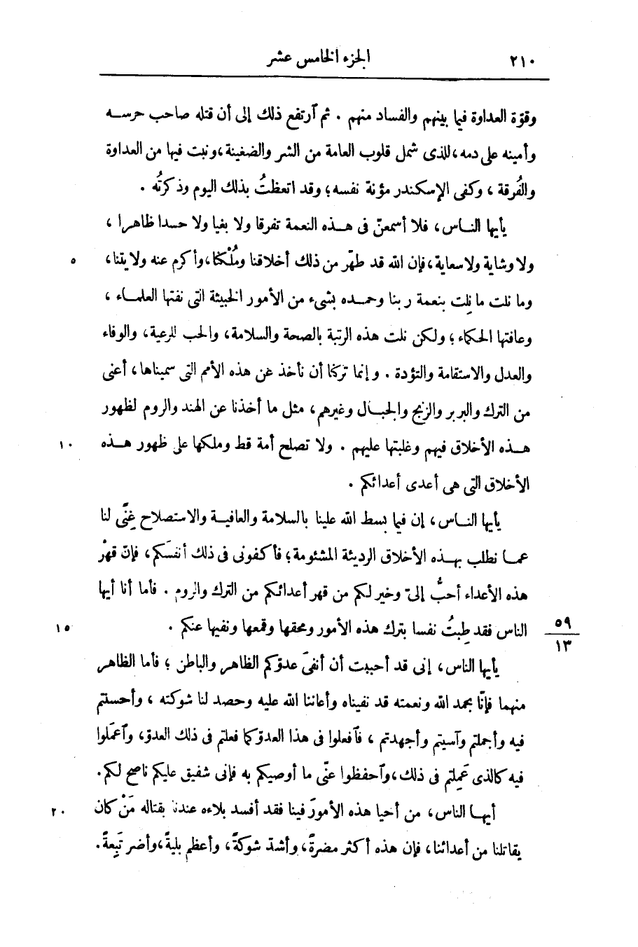 يأيها الناس، فلا أسمعنّ فى هذه النعمة تفرقا ولا بغيا ولا حسدا ظاهرا، ولا وشاية ولا سعاية، فإن الله قد طهّر من ذلك أخلاقنا وملكنا، وأكرم عنه ولا يتنا، وما نلت ما نلت بنعمة ربنا وحمده بشىء من الأمور الخبيثة التى نفتها العلماء، وعافتها الحكماء؛ ولكن نلت هذه الرتبة بالصحة والسلامة، والحب للرعية، والوفاء والعدل والاستقامة والتؤدة. وإنما تركنا أن نأخذ عن هذه الأمم التى سميناها، أعنى من الترك والبربر والزنج والجبال وغيرهم، مثل ما أخذنا عن الهند والروم لظهور هذه الأخلاق فيهم وغلبتها عليهم. ولا تصلح أمة قط وملكها على ظهور هذه الأخلاق التى هى أعدى أعدائكم.