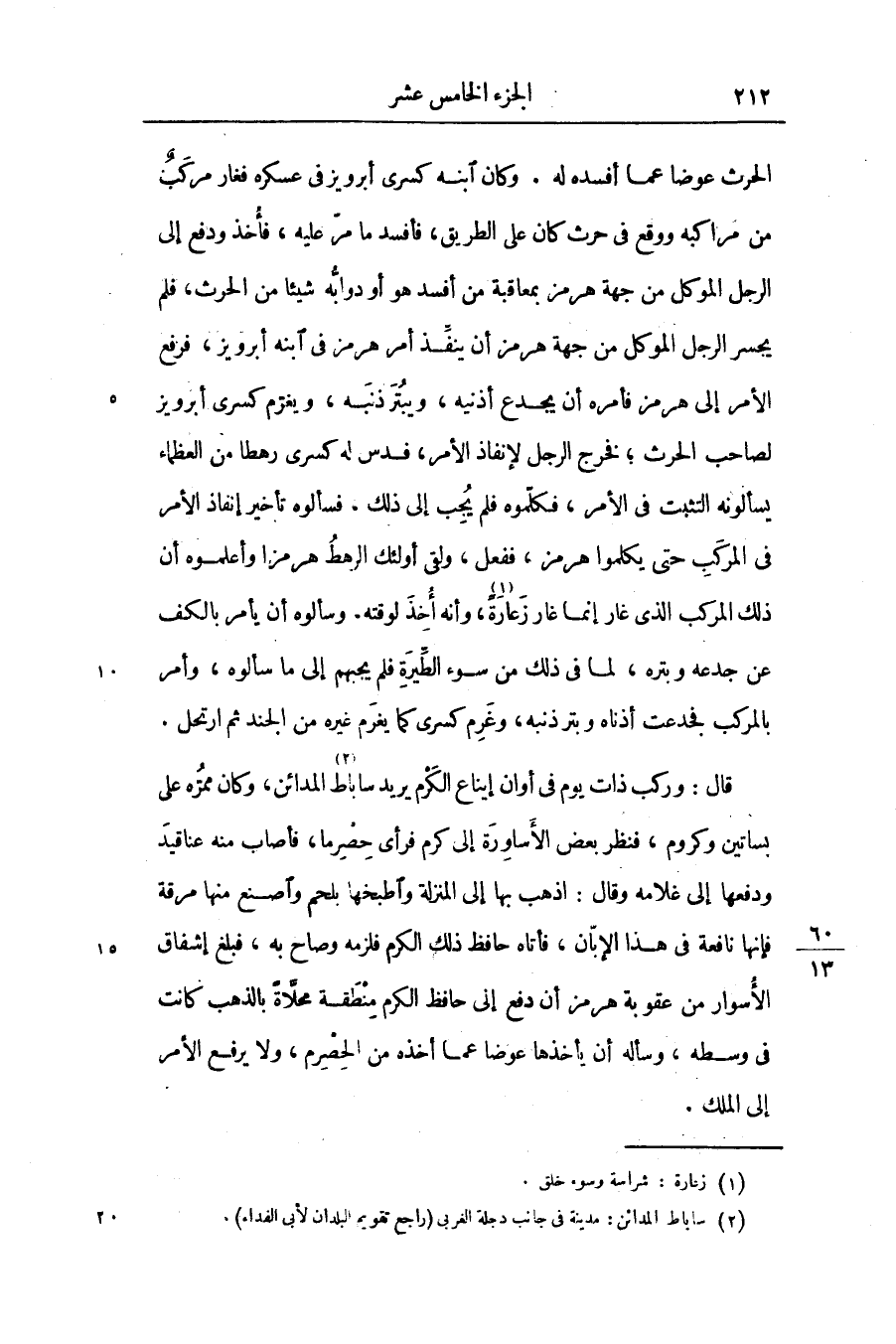 الحرث عوضا عما أفسده له. وكان ابنه كسرى أبرويز فى عسكره فغار مركب من مراكبه ووقع فى حرث كان على الطريق، فأفسد ما مرّ عليه، فأخذ ودفع إلى الرجل الموكل من جهة هرمز بمعاقبة من أفسد هو أو دوابّه شيئا من الحرث، فلم يجسر الرجل الموكل من جهة هرمز أن ينفّذ أمر هرمز فى ابنه أبرويز، فرفع الأمر إلى هرمز فأمره أن يجدع أذنيه، ويبتر ذنبه، ويغرّم كسرى أبرويز لصاحب الحرث؛ فخرج الرجل لإنفاذ الأمر، فدس له كسرى رهطا من العظماء يسألونه التثبت فى الأمر، فكلّموه فلم يجب إلى ذلك. فسألوه تأخير إنفاذ الأمر فى المركب حتى يكلموا هرمز، ففعل، ولقى أولئك الرهط هرمزا وأعملوه أن ذلك المركب الذى غار إنما غار زعارة «1» ، وأنه أخذ لوقته. وسألوه أن يأمر بالكف عن جدعه وبتره، لما فى ذلك من سوء الطّيرة فلم يجبهم إلى ما سألوه، وأمر بالمركب فجدعت أذناه وبترذنبه، وغرم كسرى كما يغرم غيره من الجند ثم ارتحل.