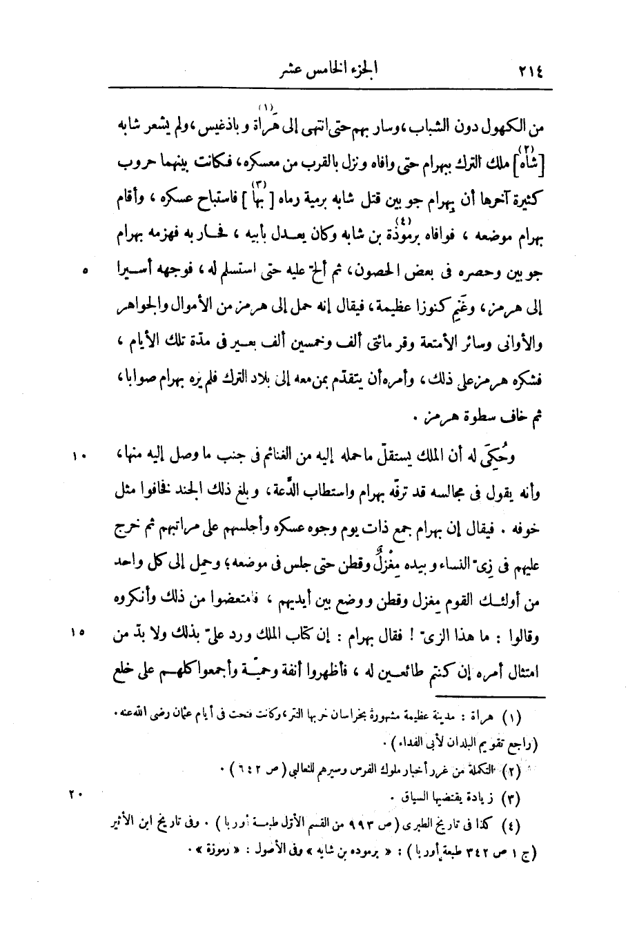من الكهول دون الشباب، وسار بهم حتى انتهى إلى هراة «1» وباذغيس، ولم يشعر شابه [شاه «2» ] ملك الترك ببهرام حتى وافاه ونزل بالقرب من معسكره، فكانت بينهما حروب كثيرة آخرها أن بهرام جوبين قتل شابه برمية رماه [بها «3» ] فاستباح عسكره، وأقام بهرام موضعه، فوافاه برموذة «4» بن شابه وكان يعدل بأبيه، فحار به فهزمه بهرام جوبين وحصره فى بعض الحصون، ثم ألحّ عليه حتى استسلم له، فوجهه أسيرا إلى هرمز، وغنم كنوزا عظيمة، فيقال إنه حمل إلى هرمز من الأموال والجواهر والأوانى وسائر الأمتعة وقرمائتى ألف وخمسين ألف بعير فى مدّة تلك الأيام، فشكره هرمز على ذلك، وأمره أن يتقدّم بمن معه إلى بلاد الترك فلم يره بهرام صوابا، ثم خاف سطوة هرمز.