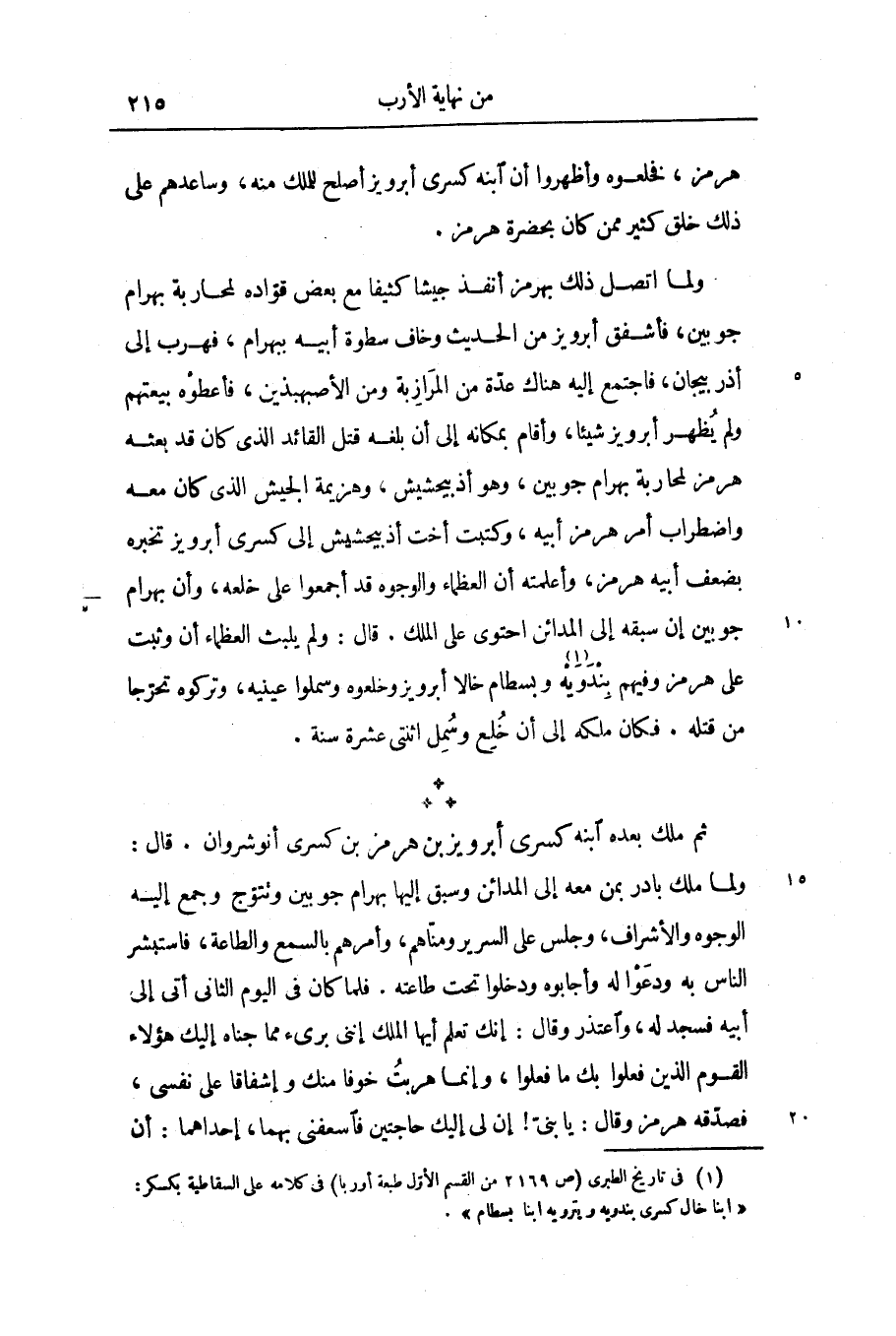 ولما اتصل ذلك بهرمز أنفذ جيشا كثيفا مع بعض قوّاده لمحاربة بهرام جوبين، فأشفق أبرويز من الحديث وخاف سطوة أبيه ببهرام، فهرب إلى أذربيجان، فاجتمع إليه هناك عدّة من المرازبة ومن الأصبهبذين، فأعطوه بيعتهم ولم يظهر أبرويز شيئا، وأقام بمكانه إلى أن بلغه قتل القائد الذى كان قد بعثه هرمز لمحاربة بهرام جوبين، وهو أذبيحشيش، وهزيمة الجيش الذى كان معه واضطراب أمر هرمز أبيه، وكتبت أخت أذبيحشيش إلى كسرى أبرويز تخبره بضعف أبيه هرمز، وأعلمته أن العظماء والوجوه قد أجمعوا على خلعه، وأن بهرام جوبين إن سبقه إلى المدائن احتوى على الملك. قال: ولم يلبث العظماء أن وثبت على هرمز وفيهم بندويه «1» وبسطام خالا أبرويز وخلعوه وسملوا عينيه، وتركوه تحرّجا من قتله. فكان ملكه إلى أن خلع وسمل اثنتى عشرة سنة.