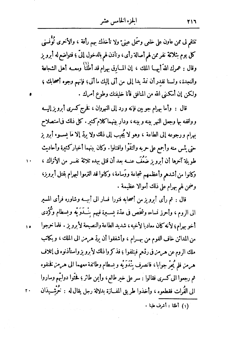 قال: وأما بهرام جوبين فإنه ورد إلى النهروان، فخرج كسرى أبرويز إليه وواقفه بها وجعل النهر بينه وبينه، ودار بينهما كلام كثير. كل ذلك فى استصلاح بهرام ورجوعه إلى الطاعة، وهو لا يجيب إلى ذلك ولا يردّ إلا ما يسوء أبرويز حتى يئس منه وأجمع على حربه والتقوا واقتتلوا. وكان بينهما أخبار كثيرة وأحاديث طويلة آخرها أن أبرويز ضعف عنه بعد أن قتل بيده ثلاثة نفر من الأتراك، وكانوا من أشدهم وأعظمهم شجاعة ووسامة، وكانوا قد التزموا لبهرام بقتل أبرويز، وضمن لهم بهرام على ذلك أموالا عظيمة.