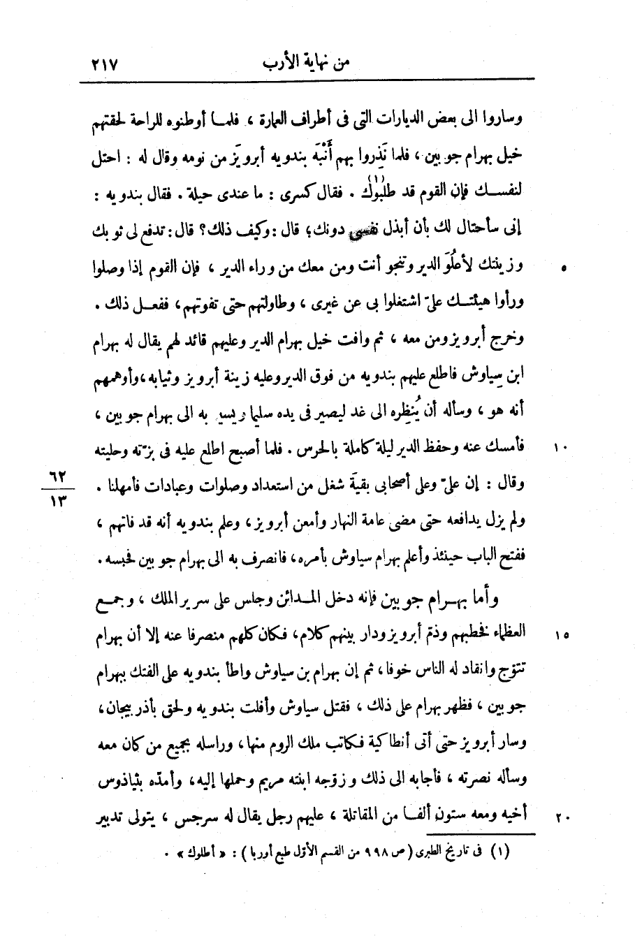 وساروا الى بعض الديارات التى فى أطراف العمارة، فلما أوطنوه للراحة لحقتهم خيل بهرام جوبين، فلما نذروا بهم أنبه بندويه أبرويز من نومه وقال له: احتل لنفسك فإن القوم قد طلبوك «1» . فقال كسرى: ما عندى حيلة. فقال بندويه: