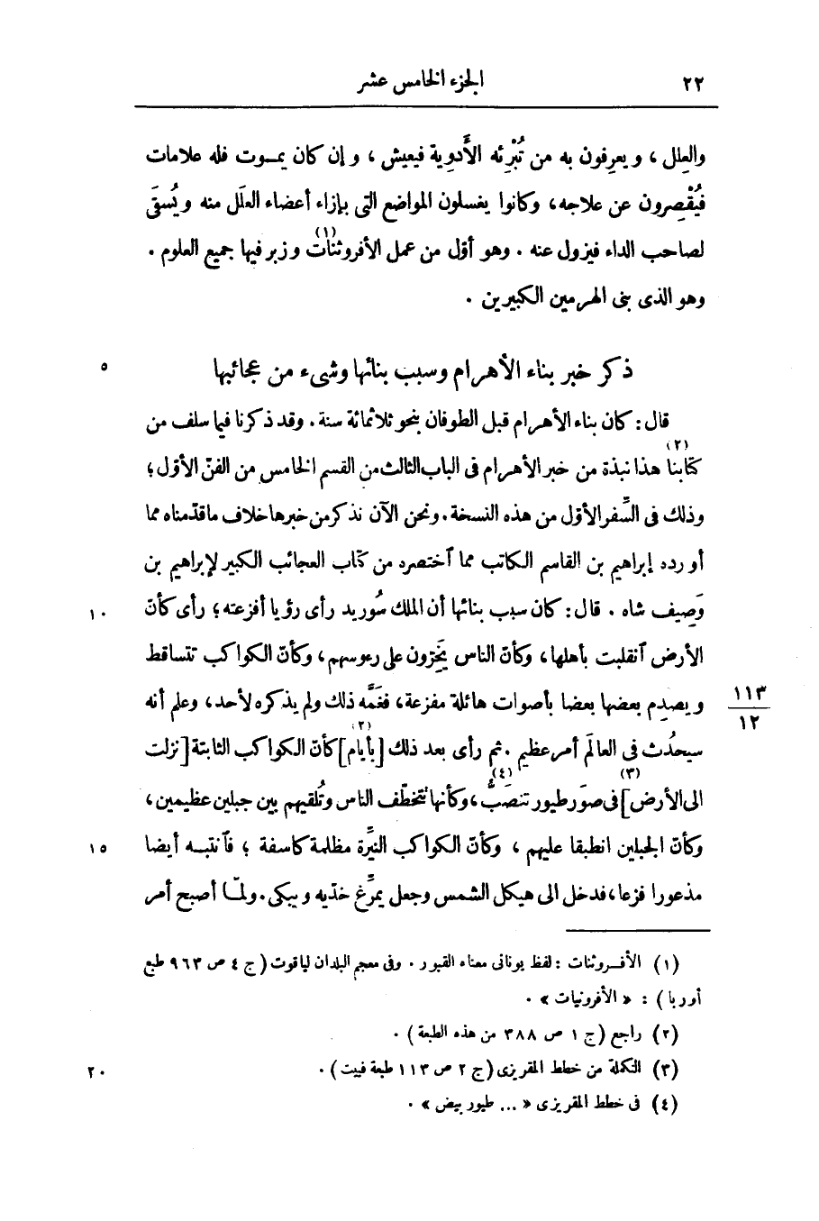 قال: كان بناء الأهرام قبل الطوفان بنحو ثلاثمائة سنة. وقد ذكرنا فيما سلف من كتابنا «2» هذا نبذة من خبر الأهرام فى الباب الثالث من القسم الخامس من الفنّ الأوّل؛ وذلك فى السّفر الأوّل من هذه النسخة. ونحن الآن نذكر من خبرها خلاف ما قدّمناه مما أورده إبراهيم بن القاسم الكاتب مما اختصره من كتاب العجائب الكبير لإبراهيم بن وصيف شاه. قال: كان سبب بنائها أن الملك سوريد رأى رؤيا أفزعته؛ رأى كأنّ الأرض انقلبت بأهلها، وكأنّ الناس يخرّون على رءوسهم، وكأنّ الكواكب تتساقط ويصدم بعضها بعضا بأصوات هائلة مفزعة، فغمّه ذلك ولم يذكره لأحد، وعلم أنه سيحدث فى العالم أمر عظيم. ثم رأى بعد ذلك [بأيام] كأنّ الكواكب الثابتة [نزلت الى الأرض «3» ] فى صور طيور تنصبّ «4» ، وكأنها تتخطّف الناس وتلقيهم بين جبلين عظيمين، وكأنّ الجبلين انطبقا عليهم، وكأنّ الكواكب النيّرة مظلمة كاسفة؛ فانتبه أيضا مذعورا فزعا، فدخل الى هيكل الشمس وجعل يمرّغ خدّيه ويبكى. ولمّا أصبح أمر