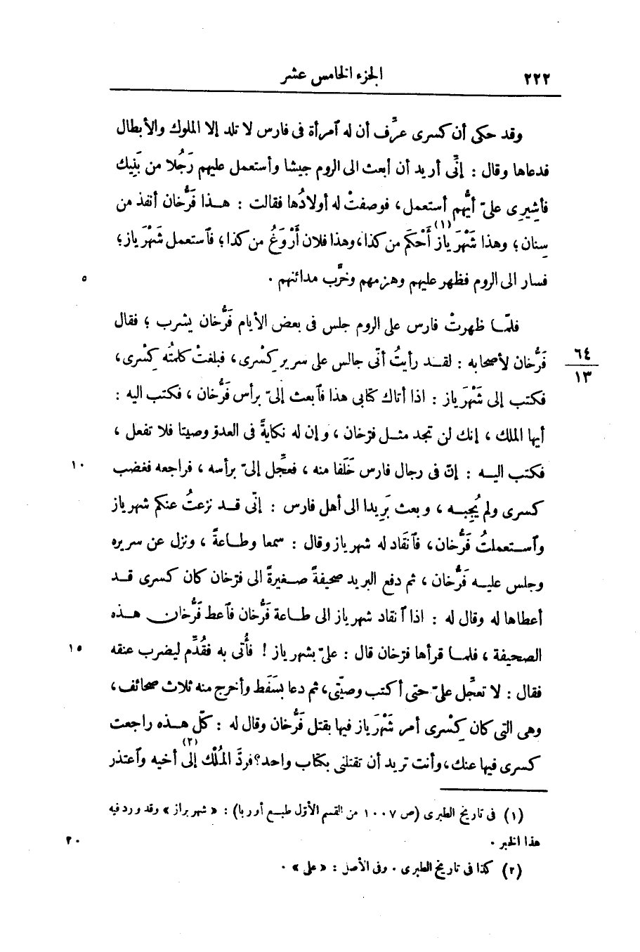 أيها الملك، إنك لن تجد مثل فرّخان، وإن له نكاية فى العدوّ وصيتا فلا تفعل، فكتب اليه: إنّ فى رجال فارس خلفا منه، فعجّل إلىّ برأسه، فراجعه فغضب كسرى ولم يجبه، وبعث بريدا الى أهل فارس: إنّى قد نزعت عنكم شهرياز واستعملت فرّخان، فانقاد له شهرياز وقال: سمعا وطاعة، ونزل عن سريره وجلس عليه فرّخان، ثم دفع البريد صحيفة صغيرة الى فرّخان كان كسرى قد أعطاها له وقال له: اذا انقاد شهرياز الى طاعة فرّخان فاعط فرّخان هذه الصحيفة، فلما قرأها فرّخان قال: علىّ بشهرياز! فأتى به فقدّم ليضرب عنقه فقال: لا تعجّل علىّ حتى أكتب وصيّتى، ثم دعا بسفط وأخرج منه ثلاث صحائف، وهى التى كان كسرى أمر شهرياز فيها بقتل فرّخان وقال له: كلّ هذه راجعت كسرى فيها عنك، وأنت تريد أن تقتلنى بكتاب واحد؟ فردّ الملك إلى «2» أخيه واعتذر