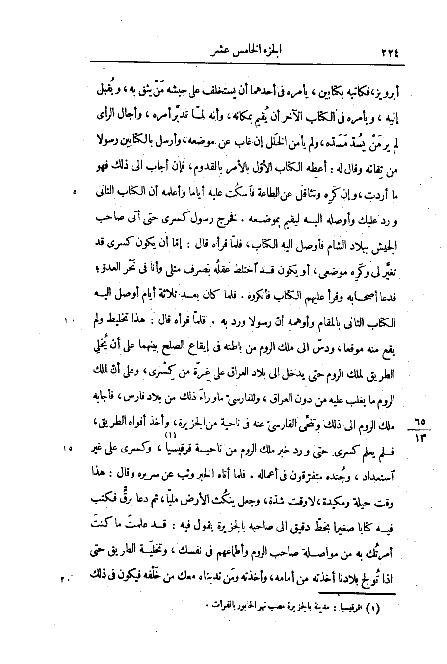 أبرويز، فكاتبه بكتابين، يأمره فى أحدهما أن يستخلف على جيشه من يثق به، ويقبل إليه، ويأمره فى الكتاب الآخر أن يقيم بمكانه، وأنه لمّا تدبّر أمره، وأجال الرأى لم ير من يسدّ مسدّه، ولم يأمن الخلل إن غاب عن موضعه، وأرسل بالكتابين رسولا من ثقاته وقال له: أعطه الكتاب الأوّل بالأمر بالقدوم، فإن أجاب الى ذلك فهو ما أردت، وإن كره وتثاقل عن الطاعة فاسكت عليه أياما وأعلمه أن الكتاب الثانى ورد عليك وأوصله اليه ليقيم بموضعه. فخرج رسول كسرى حتى أتى صاحب الجيش ببلاد الشام فأوصل اليه الكتاب، فلمّا قرأه قال: إمّا أن يكون كسرى قد تغيّر لى وكره موضعى، أو يكون قد اختلط عقله بصرف مثلى وأنا فى نحر العدوّ؛ فدعا أصحابه وقرأ عليهم الكتاب فأنكروه. فلما كان بعد ثلاثة أيام أوصل اليه الكتاب الثانى بالمقام وأوهمه أنّ رسولا ورد به. فلمّا قرأه قال: هذا تخليط ولم يقع منه موقعا، ودسّ الى ملك الروم من باطنه فى إيقاع الصلح بينهما على أن يخلى الطريق لملك الروم حتى يدخل الى بلاد العراق على غرّة من كسرى، وعلى أنّ لملك الروم ما يغلب عليه من دون العراق، وللفارسىّ ماوراء ذلك من بلاد فارس، فأجابه ملك الروم الى ذلك وتنحّى الفارسىّ عنه فى ناحية من الجزيرة، وأخذ أفواه الطريق، فلم يعلم كسرى حتى ورد خبر ملك الروم من ناحية قرقيسيا، «1» وكسرى على غير استعداد، وجنده متفرّقون فى أعماله. فلما أتاه الخبر وثب عن سريره وقال: هذا وقت حيلة ومكيدة، لا وقت شدّة، وجعل ينكث الأرض مليّا، ثم دعا برقّ فكتب فيه كتابا صغيرا بخطّ دقيق الى صاحبه بالجزيرة يقول فيه: قد علمت ما كنت أمرتك به من مواصلة صاحب الروم وأطماعهم فى نفسك، وتخلية الطريق حتى اذا تولج بلادنا أخذته من أمامه، وأخذته ومن ندبناه معك من خلفه فيكون فى ذلك