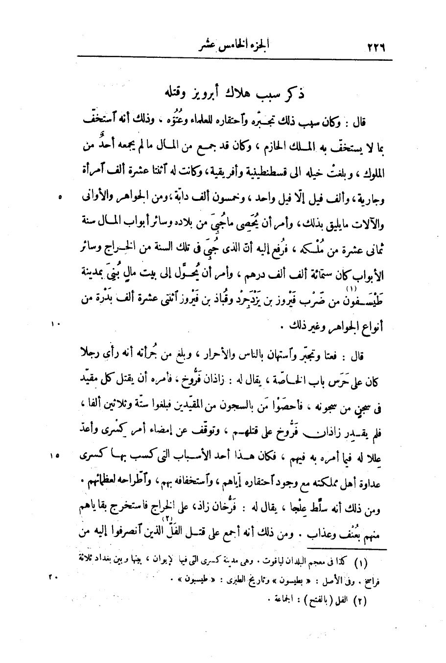 قال: وكان سبب ذلك تجبره واحتقاره للعلماء وعتوّه، وذلك أنه استخفّ بما لا يستخفّ به الملك الحازم، وكان قد جمع من المال ما لم يجمعه أحد من الملوك، وبلغت خيله الى قسطنطينية وأفريقية، وكانت له اثنتا عشرة ألف امرأة وجارية، وألف فيل إلّا فيل واحد، وخمسون ألف دابّة، ومن الجواهر والأوانى والآلات ما يليق بذلك، وأمر أن يحصى ما جبى من بلاده وسائر أبواب المال سنة ثمانى عشرة من ملكه، فرفع إليه أنّ الذى جبى فى تلك السنة من الخراج وسائر الأبواب كان ستمائة ألف ألف درهم، وأمر أن يحوّل إلى بيت مال بنى بمدينة طيسفون «1» من ضرب فيروز بن يزدجرد وقباذ بن فيروز اثنتى عشرة ألف بدرة من أنواع الجواهر وغير ذلك.