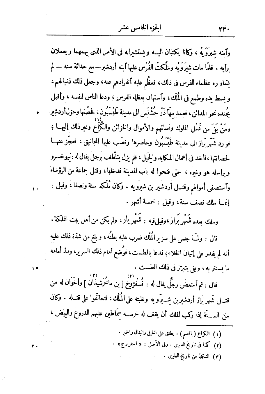 وابنه شيرويه، وكانا يكتبان اليه ويستشيرانه فى الأمر الذى يهمهما ويعملان برأيه. فلمّا مات شيرويه وملّكت الفرس عليها ابنه أردشير- مع حداثة سنه- لم يشاوره عظماء الفرس فى ذلك، فعظم عليه انفرادهم عنه، وجعل ذلك ذنبا لهم، وبسط يده وطمع فى الملك، واستهان بعظماء الفرس، ودعا الناس لنفسه، وأقبل بجنده نحو المدائن، فعمد مهآذر جشنس الى مدينة طيسبون، فحصّنها وحوّل أردشير ومن بقى من نسل الملوك ونسائهم والأموال والخزائن والكراع «1» وغير ذلك إليها؛ فورد شهر براز الى مدينة طيسبون وحاصرها ونصب عليها المجانيق، فعجز عنها لحصانتها، فأخذ فى أعمال المكايد والحيل، فلم يزل يتلّطف برجل يقال له: نيوخسرو ويراسله هو وغيره، حتى فتحوا له باب المدينة فدخلها، وقتل جماعة من الرؤساء واستصفى أموالهم وقتل أردشير بن شيرويه. وكان ملكه سنة ونصفا، وقيل: