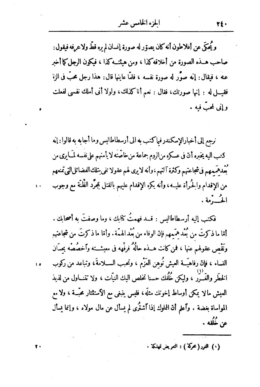 نرجع إلى أخبار الإسكندر فيما كتب به الى أرسطاطاليس وما أجابه به قالوا: إنه كتب اليه يخبره أنّ فى عسكره من الروم جماعة من خاصّته لا يأمنهم على نفسه لما يرى من بعدهممهم فى شجاعتهم وكثرة آلتهم، وأنه لا يرى لهم عقولا تفى بتلك الفضائل التى تمنعهم من الإقدام والجرأة عليه، وأنه يكره الإقدام عليهم بالقتل بمجرّد الظّنّة مع وجوب الحرمة.
