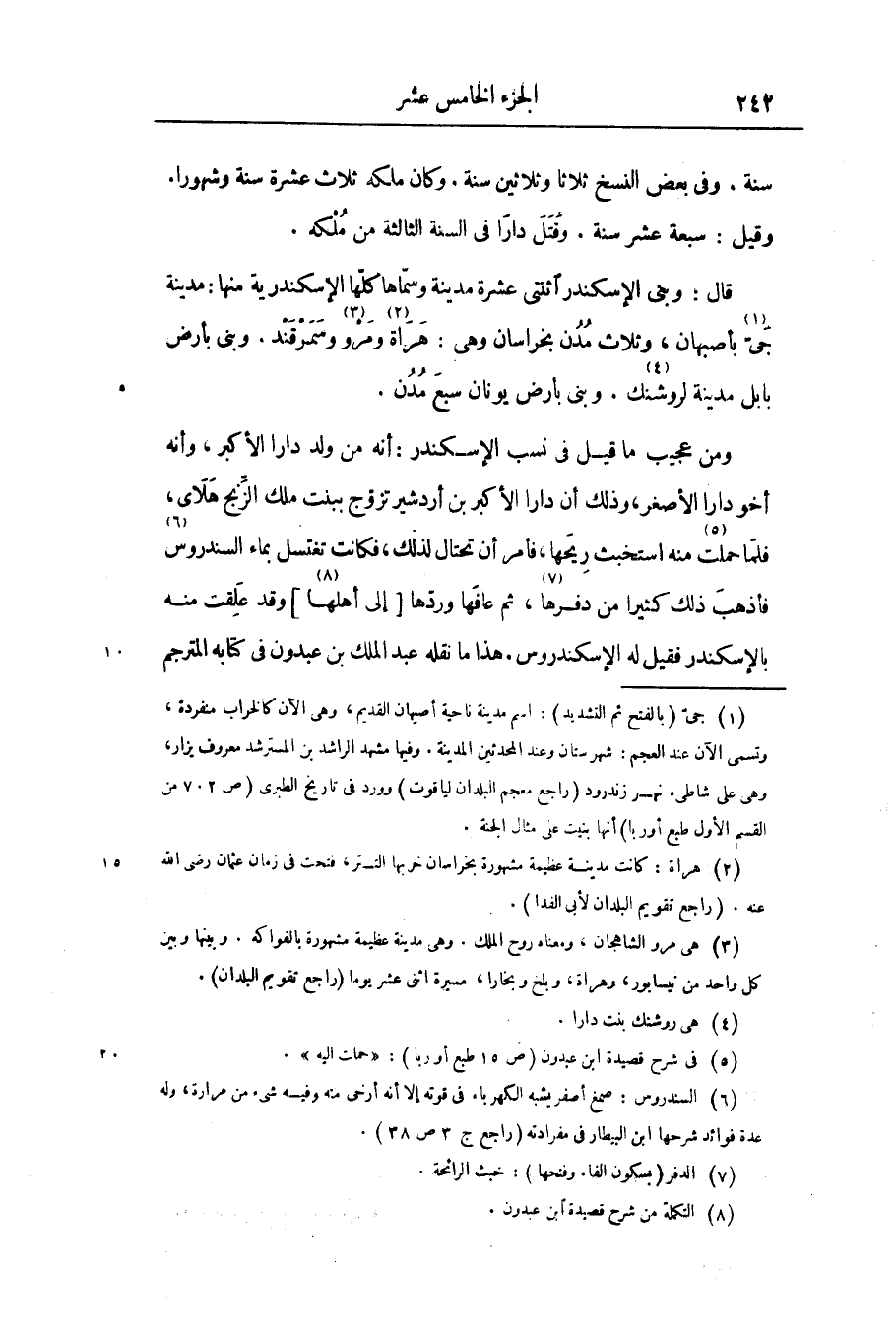 قال: وبنى الإسكندر اثنتى عشرة مدينة وسمّاها كلّها الإسكندرية منها: مدينة جىّ «1» بأصبهان، وثلاث مدن بخراسان وهى: هراة «2» ومرو «3» وسمرقند. وبنى بأرض بابل مدينة لروشنك «4» . وبنى بأرض يونان سبع مدن.