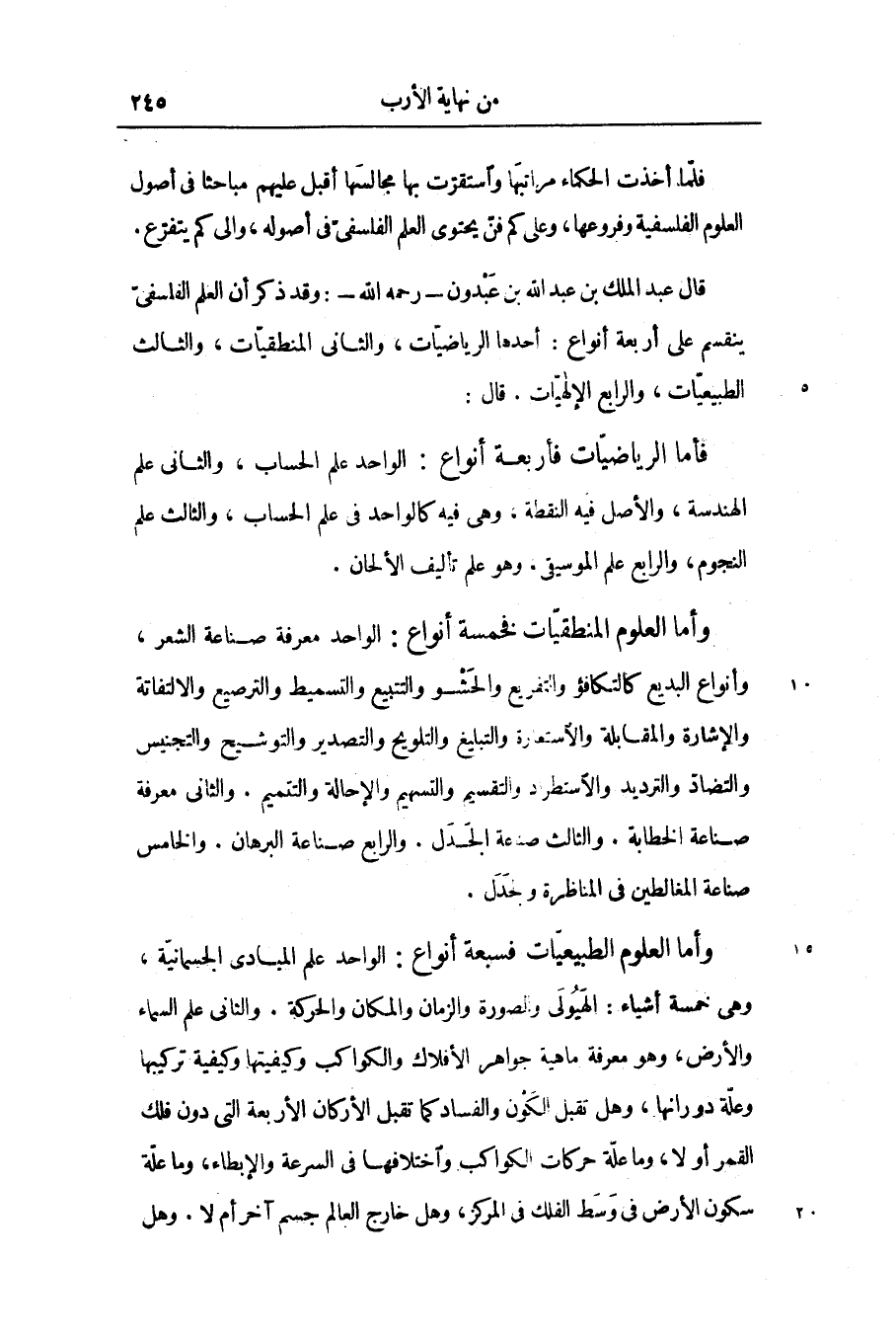 قال عبد الملك بن عبد الله بن عبدون- رحمه الله-: وقد ذكر أن العلم الفلسفىّ ينقسم على أربعة أنواع: أحدها الرياضيّات، والثانى المنطقيّات، والثالث الطبيعيّات، والرابع الإلهيّات. قال: