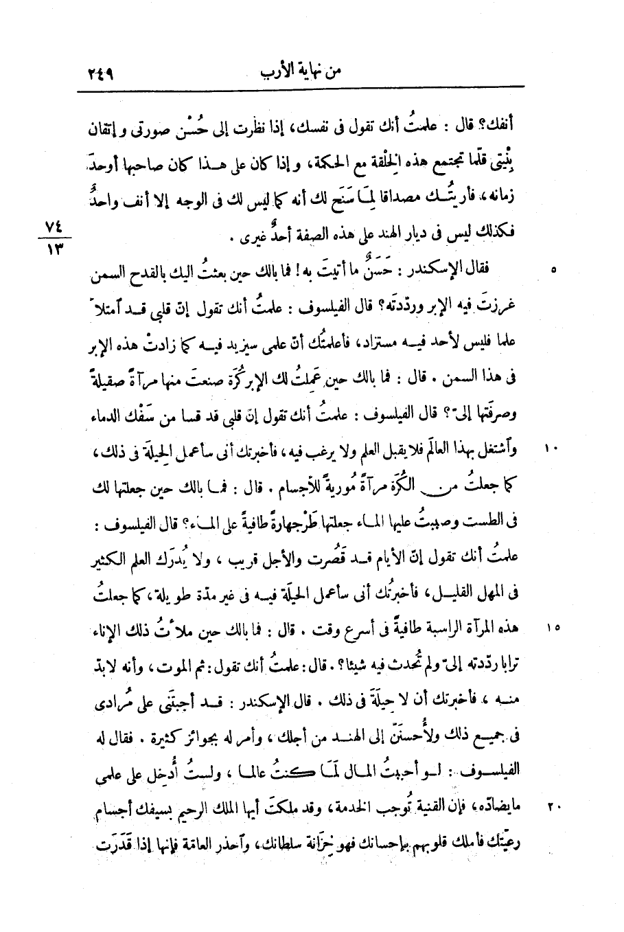 علمت أنك تقول إنّ الأيام قد قصرت والأجل قريب، ولا يدرك العلم الكثير فى المهل القليل، فأخبرتك أنى سأعمل الحيلة فيه فى غير مدّة طويلة، كما جعلت هذه المرآة الراسبة طافية فى أسرع وقت. قال: فما بالك حين ملأت ذلك الإناء ترابا ردّدته إلىّ ولم تحدث فيه شيئا؟. قال: علمت أنك تقول: ثم الموت، وأنه لا بدّ منه، فأخبرتك أن لا حيلة فى ذلك. قال الإسكندر: قد أجبتنى على مرادى فى جميع ذلك ولأحسننّ إلى الهند من أجلك، وأمر له بجوائز كثيرة. فقال له الفيلسوف: لو أحببت المال لما كنت عالما، ولست أدخل على علمى ما يضادّه، فإن القنية توجب الخدمة، وقد ملكت أيها الملك الرحيم بسيفك أجسام رعيّتك فأملك قلوبهم بإحسانك فهو خزانة سلطانك، واحذر العامّة فإنها إذا قدرت