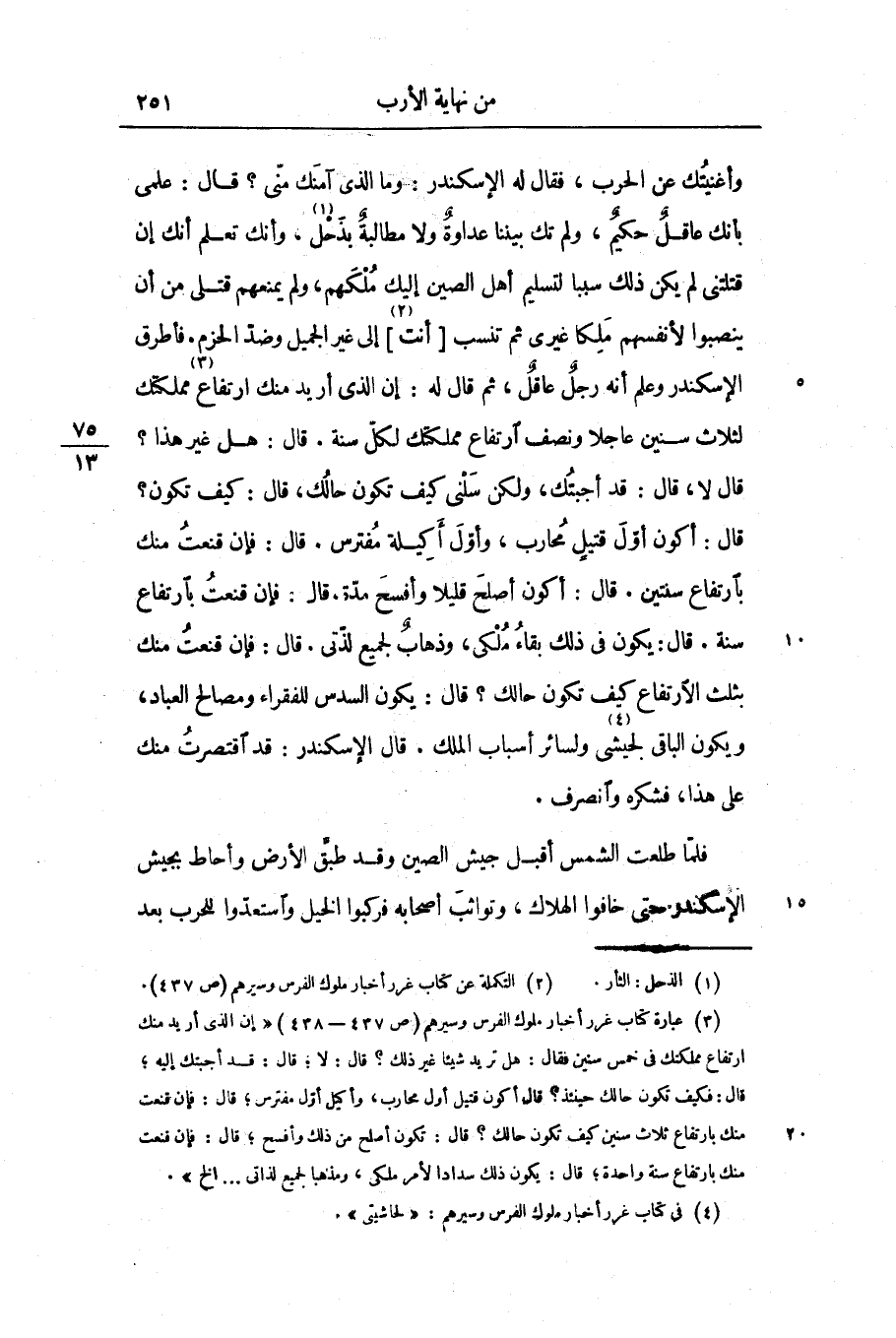 قال: أكون أوّل قتيل محارب، وأوّل أكيلة مفترس. قال: فإن قنعت منك بارتفاع سنتين. قال: أكون أصلح قليلا وأفسح مدّة، قال: فإن قنعت بارتفاع سنة. قال: يكون فى ذلك بقاء ملكى، وذهاب لجميع لذّتى. قال: فإن قنعت منك بثلث الارتفاع كيف تكون حالك؟ قال: يكون السدس للفقراء ومصالح العباد، ويكون الباقى لجيشى «4» ولسائر أسباب الملك. قال الإسكندر: قد اقتصرت منك على هذا، فشكره وانصرف.
