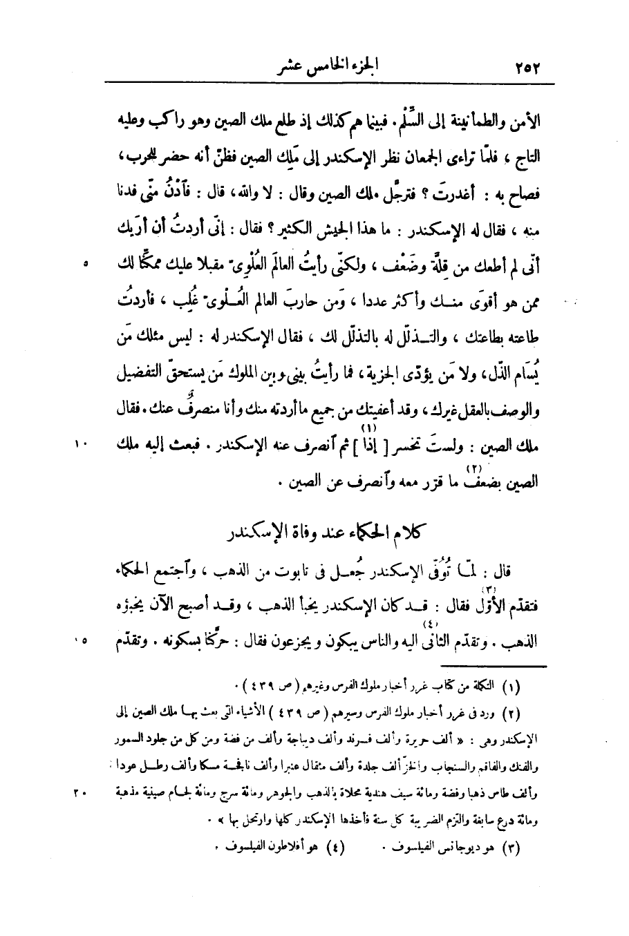 الأمن والطمأنينة إلى السّلم. فبينما هم كذلك إذ طلع ملك الصين وهو راكب وعليه التاج، فلمّا تراءى الجمعان نظر الإسكندر إلى ملك الصين فظنّ أنه حضر للحرب، فصاح به: أغدرت؟ فترجّل ملك الصين وقال: لا والله، قال: فادن منّى فدنا منه، فقال له الإسكندر: ما هذا الجيش الكثير؟ فقال: إنّى أردت أن أريك أنّى لم أطعك من قلّة وضعف، ولكنّى رأيت العالم العلوىّ مقبلا عليك ممكنّا لك ممن هو أقوى منك وأكثر عددا، ومن حارب العالم العلوىّ غلب، فأردت طاعته بطاعتك، والتذلّل له بالتذلّل لك، فقال الإسكندر له: ليس مئلك من يسام الذّل، ولا من يؤدّى الجزية، فما رأيت بينى وبين الملوك من يستحقّ التفضيل والوصف بالعقل غيرك، وقد أعفيتك من جميع ما أردته منك وأنا منصرف عنك. فقال ملك الصين: ولست تخسر [إذا «1» ] ثم انصرف عنه الإسكندر. فبعث إليه ملك الصين بضعف «2» ما قرّر معه وانصرف عن الصين.