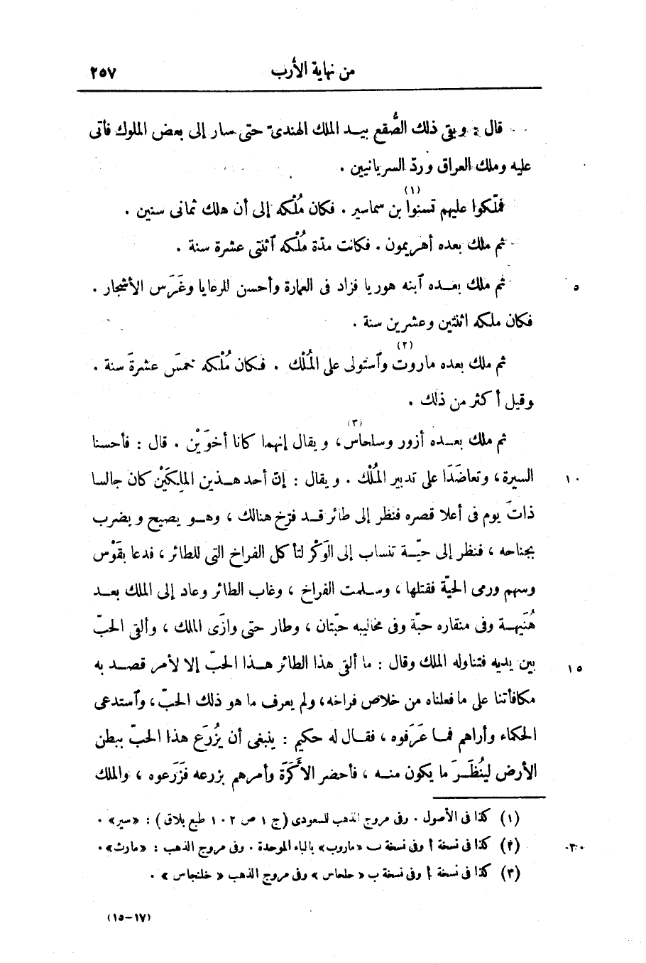 ثم ملك بعده أزور وسلحاس «3» ، ويقال إنهما كانا أخوين. قال: فأحسنا السيرة، وتعاضدا على تدبير الملك. ويقال: إنّ أحد هذين الملكين كان جالسا ذات يوم فى أعلا قصره فنظر إلى طائر قد فرّخ هنالك، وهو يصيح ويضرب بجناحه، فنظر إلى حيّة تنساب إلى الوكر لتأكل الفراخ التى للطائر، فدعا بقوس وسهم ورمى الحيّة فقتلها، وسلمت الفراخ، وغاب الطائر وعاد إلى الملك بعد هنيهة وفى منقاره حبّة وفى مخاليبه حبّتان، وطار حتى وازى الملك، وألقى الحبّ بين يديه فتناوله الملك وقال: ما ألقى هذا الطائر هذا الحبّ إلا لأمر قصد به مكافأتنا على ما فعلناه من خلاص فراخه، ولم يعرف ما هو ذلك الحبّ، واستدعى الحكماء وأراهم فما عرفوه، فقال له حكيم: ينبغى أن يزرع هذا الحبّ ببطن الأرض لينظر ما يكون منه، فأحضر الأكرة وأمرهم بزرعه فزرعوه، والملك