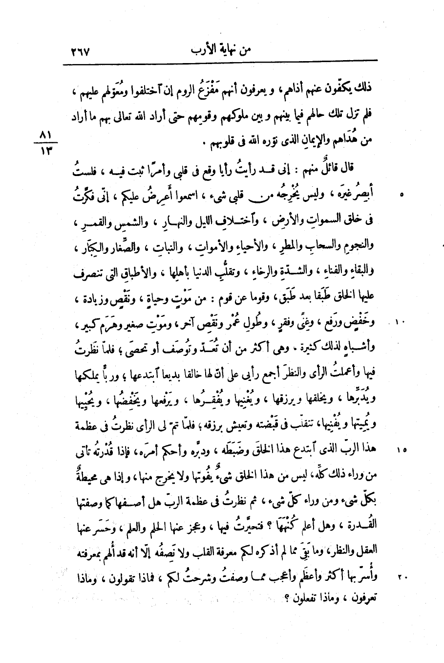 قال قائل منهم: إنى قد رأيت رأيا وقع فى قلبى وأمرا ثبت فيه، فلست أبصر غيره، وليس يخرجه من قلبى شىء، اسمعوا أعرض عليكم، إنّى فكّرت فى خلق السموات والأرض، واختلاف الليل والنهار، والشمس والقمر، والنجوم والسحاب والمطر، والأحياء والأموات، والنبات، والصّغار والكبار، والبقاء والفناء، والشدّة والرخاء، وتقلّب الدنيا بأهلها، والأطباق التى تنصرف عليها الخلق طبقا بعد طبق، وقوما عن قوم: من موت وحياة، ونقص وزيادة، وخفض ورفع، وغنى وفقر، وطول عمر ونقص آخر، وموت صغير وهرم كبير، وأشباه لذلك كثيرة، وهى أكثر من أن تعدّ وتوصف أو تحصى؛ فلمّا نظرت فيها وأعملت الرأى والنظر أجمع رأيى على أنّ لها خالقا بديعا ابتدعها؛ وربّا يملكها ويدبّرها، ويخلقها ويرزقها، ويغنيها ويفقرها، ويرفعها ويخفضها، ويحييها ويميتها ويفنيها، تتقلّب فى قبضته وتعيش برزقه؛ فلمّا تمّ لى الرأى نظرت فى عظمة هذا الربّ الذى ابتدع هذا الخلق وضبطه، ودبّره وأحكم أمره، فإذا قدرته تأتى من وراء ذلك كلّه، ليس من هذا الخلق شىء يفوتها ولا يخرج منها، وإذا هى محيطة بكلّ شىء ومن وراء كلّ شىء، ثم نظرت فى عظمة الربّ هل أصفها كما وصفتها القدرة، وهل أعلم كنهها؟ فتحيّرت فيها، وعجز عنها الحلم والعلم، وحسر عنها العقل والنظر، وما بقى مما لم أذكره لكم معرفة القلب ولا نصفه إلّا أنه قد ألهم بمعرفته وأسرّ بها أكثر وأعظم وأعجب مما وصفت وشرحت لكم، فماذا تقولون، وماذا تعرفون، وماذا تفعلون؟