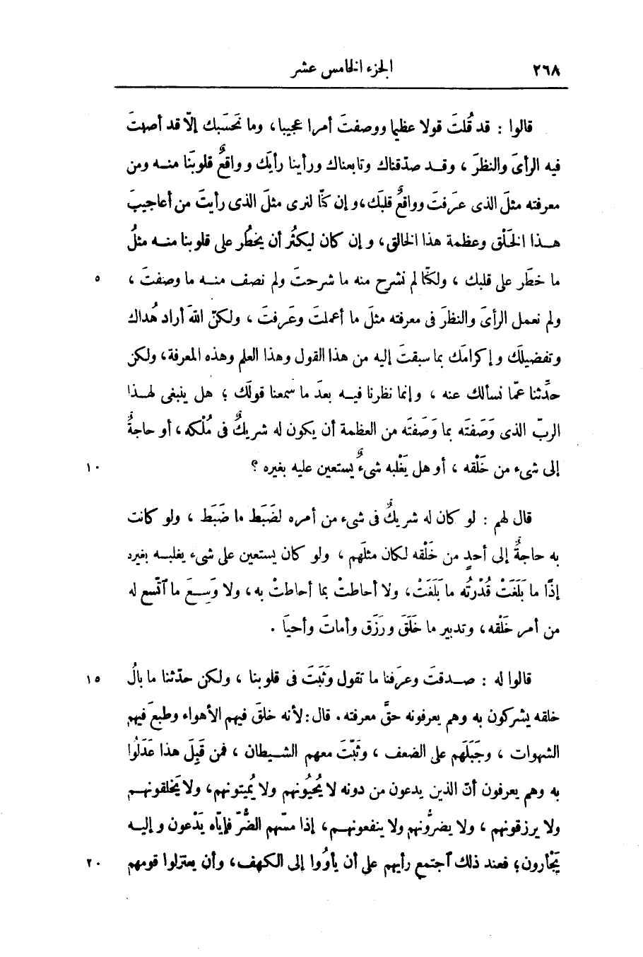 قالوا له: صدقت وعرفنا ما تقول وثبت فى قلوبنا، ولكن حدّثنا ما بال خلقه يشركون به وهم يعرفونه حقّ معرفته. قال: لأنه خلق فيهم الأهواء وطبع فيهم الشهوات، وجبلهم على الضعف، وثبّت معهم الشيطان، فمن قبل هذا عدلوا به وهم يعرفون أنّ الذين يدعون من دونه لا يحيونهم ولا يميتونهم، ولا يخلقونهم ولا يرزقونهم، ولا يضروّنهم ولا ينفعونهم، إذا مسّهم الضّرّ فإيّاه يدعون وإليه يجأرون؛ فعند ذلك اجتمع رأيهم على أن يأووا إلى الكهف، وأن يعتزلوا قومهم