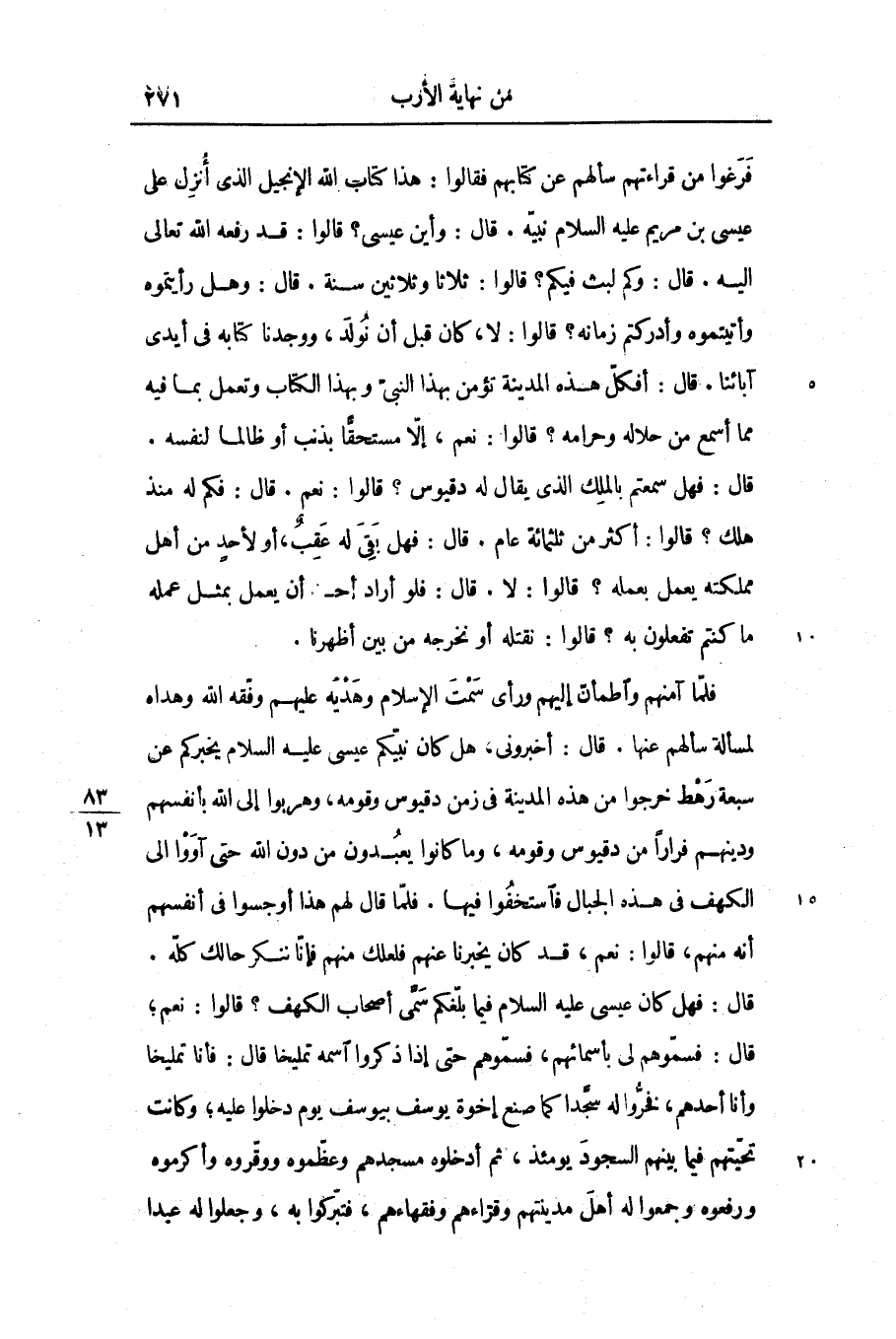 فرغوا من قراءتهم سألهم عن كتابهم فقالوا: هذا كتاب الله الإنجيل الذى أنزل على عيسى بن مريم عليه السلام نبيّه. قال: وأين عيسى؟ قالوا: قد رفعه الله تعالى اليه. قال: وكم لبث فيكم؟ قالوا: ثلاثا وثلاثين سنة. قال: وهل رأيتموه وأتيتموه وأدركتم زمانه؟ قالوا: لا، كان قبل أن نولد، ووجدنا كتابه فى أيدى آبائنا. قال: أفكلّ هذه المدينة تؤمن بهذا النبىّ وبهذا الكتاب وتعمل بما فيه مما أسمع من حلاله وحرامه؟ قالوا: نعم، إلّا مستحقّا بذنب أو ظالما لنفسه.