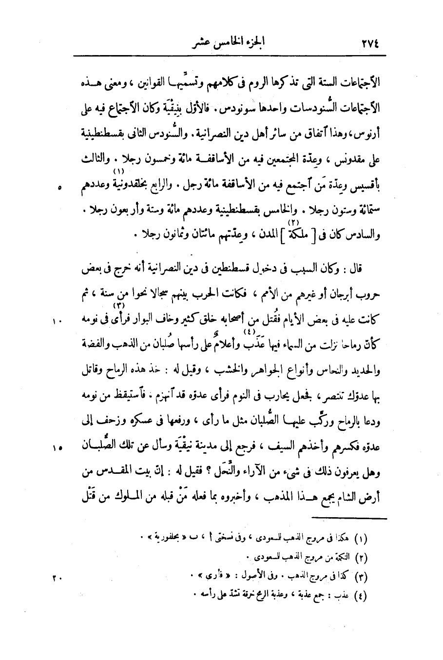 قال: وكان السبب فى دخول قسطنطين فى دين النصرانية أنه خرج فى بعض حروب أبرجان أو غيرهم من الأمم، فكانت الحرب بينهم سجالا نحوا من سنة، ثم كانت عليه فى بعض الأيام فقتل من أصحابه خلق كثير وخاف البوار فرأى «3» فى نومه كأنّ رماحا نزلت من السماء فيها عذب «4» وأعلام على رأسها صلبان من الذهب والفضة والحديد والنحاس وأنواع الجواهر والخشب، وقيل له: خذ هذه الرماح وقاتل بها عدوّك تنتصر، فجعل يحارب فى النوم فرأى عدوّه قد انهزم، فاستيقظ من نومه ودعا بالرماح وركّب عليها الصّلبان مثل ما رأى، ورفعها فى عسكره وزحف إلى عدوّه فكسرهم وأخذهم السيف، فرجع إلى مدينة نيقية وسأل عن تلك الصّلبان وهل يعرفون ذلك فى شىء من الآراء والنّحل؟ فقيل له: إنّ بيت المقدس من أرض الشام يجمع هذا المذهب، وأخبروه بما فعله من قبله من الملوك من قتل