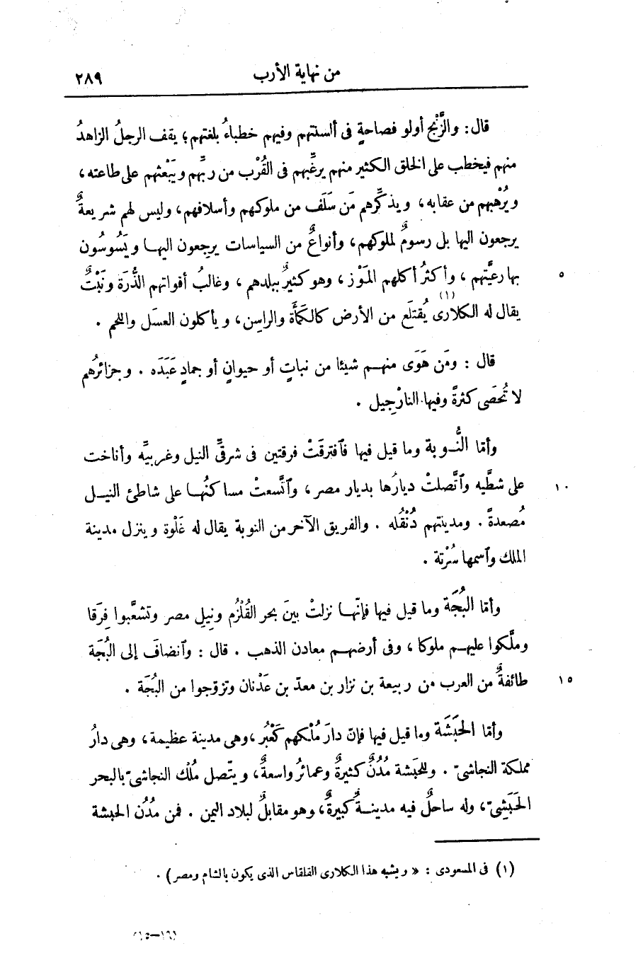 وأمّا النّوبة وما قيل فيها فافترقت فرقتين فى شرقىّ النيل وغربيّه وأناخت على شطّيه واتّصلت ديارها بديار مصر، واتّسعت مساكنها على شاطئ النيل مصعدة. ومدينتهم دنقله. والفريق الآخر من النوبة يقال له غلوة وينزل مدينة الملك واسمها سرتة.