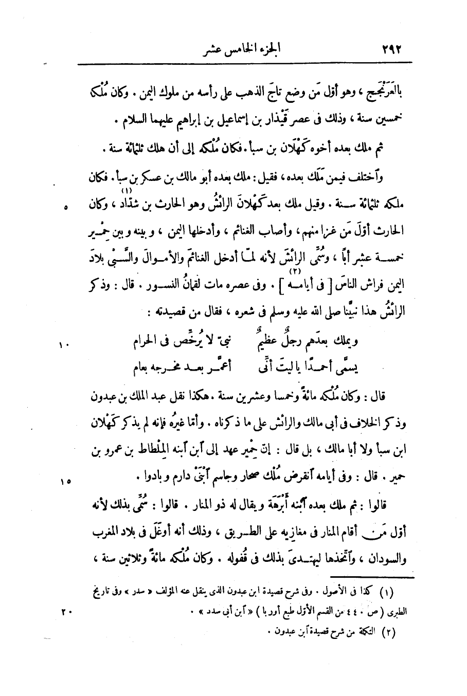 قال: وكان ملكه مائة وخمسا وعشرين سنة. هكذا نقل عبد الملك بن عبدون وذكر الخلاف فى أبى مالك والرائش على ما ذكرناه. وأمّا غيره فإنه لم يذكر كهلان ابن سبأ ولا أبا مالك، بل قال: إنّ حمير عهد إلى ابن ابنه الملطاط بن عمرو بن حمير. قال: وفى أيامه انقرض ملك صحار وجاسم ابنى دارم وبادوا.