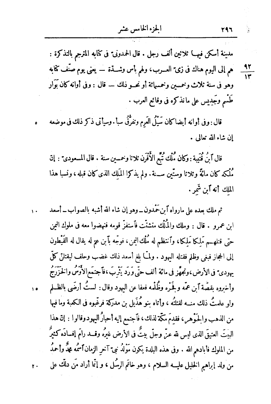 ثم ملك بعده على ما رواه ابن حمدون- وهو إن شاء الله أشبه بالصواب- أسعد ابن عمرو. قال: وملك والملك متشتّت فاستفزّ قومه فنهضوا معه فى ملوك اليمن حتى قتلهم ملكا ملكا، وانتظم له ملك اليمن، فوجّه بابن عمّ له يقال له القيطون إلى الحجاز فبغى وظلم فقتله اليهود. ولمّا بلغ أسعد ذلك غضب وحلف ليقتلنّ كلّ يهودىّ فى الأرض، وتجهّز فى مائة ألف حتّى ورد يثرب، فاجتمع الأوس والخزرج وأخبروه بقصّة ابن عمّه وفجره وظلمه فعفا عن اليهود وقال: لست أرضى بالظلم ولو علمت ذلك منه لقتلته، وأتاه بنو هذيل بن مدركة فرغّبوه فى الكعبة وما فيها من الذهب والجوهر، فقدم مكّة لذلك، فاجتمع إليه أحبار اليهود وقالوا: إنّ هذا البيت العتيق الذى ليس لله عزّ وجلّ بيت فى الأرض غيره وقد رام إفساده كثير من الملوك فأبادهم الله. وفى هذه البلدة يكون مولد نبىّ آخر الزمان اسمه محمد وأحمد من ولد إبراهيم الخليل عليه السلام، وهو خاتم الرسل، وإنّما أراد من دلّك على