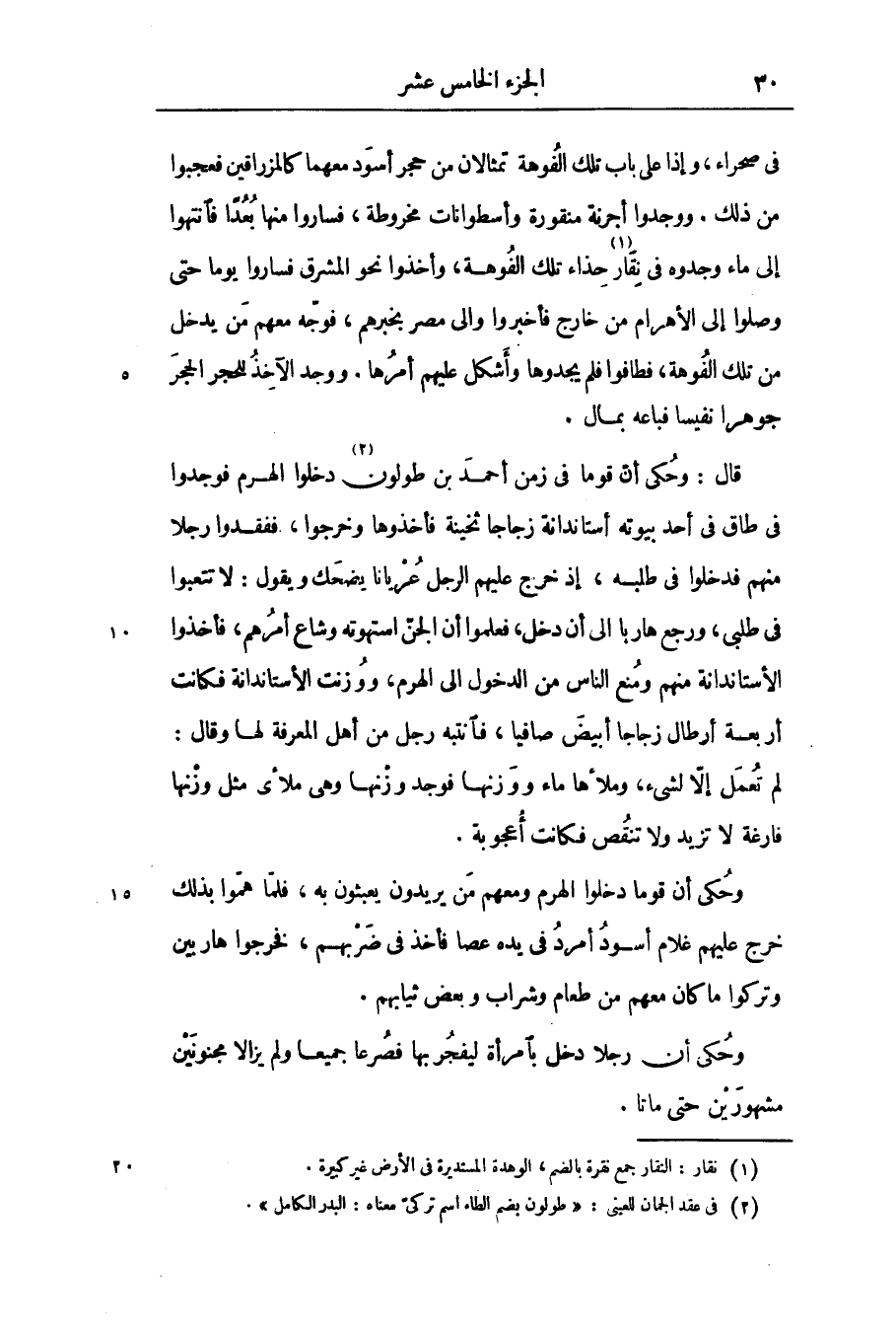 فى صحراء، وإذا على باب تلك الفوهة تمثالان من حجر أسود معهما كالمزراقين فعجبوا من ذلك. ووجدوا أجرنة منقورة وأسطوانات مخروطة، فساروا منها بعدا فانتهوا إلى ماء وجدوه فى نقار «1» حذاء تلك الفوهة، وأخذوا نحو المشرق فساروا يوما حتى وصلوا إلى الأهرام من خارج فأخبروا والى مصر بخبرهم، فوجّه معهم من يدخل من تلك الفوهة، فطافوا فلم يجدوها وأشكل عليهم أمرها. ووجد الآخذ للحجر الحجر جوهرا نفيسا فباعه بمال.