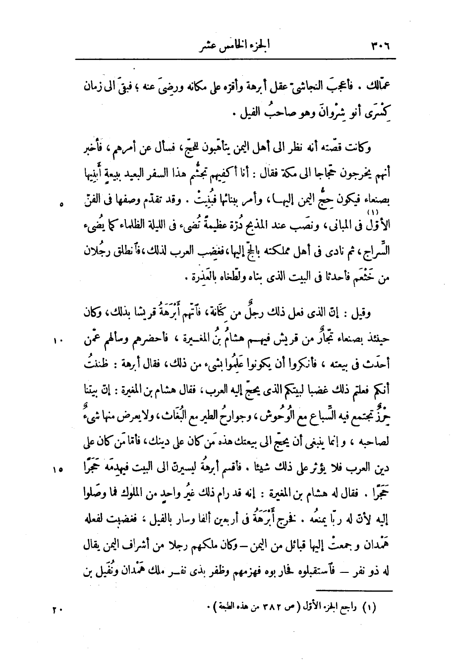 وقيل: إنّ الذى فعل ذلك رجل من كنانة، فاتّهم أبرهة قريشا بذلك، وكان حينئذ بصنعاء تجّار من قريش فيهم هشام بن المغيرة، فأحضرهم وسألهم عمّن أحدث فى بيعته، فأنكروا أن يكونوا علموا بشىء من ذلك، فقال أبرهة: ظننت أنكم فعلتم ذلك غضبا لبيتكم الذى يحجّ إليه العرب، فقال هشام بن المغيرة: إنّ بيتنا حرز تجتمع فيه السّباع مع الوحوش، وجوارح الطير مع البغاث، ولا يعرض منها شىء لصاحبه، وإنما ينبغى أن يحجّ الى بيعتك هذه من كان على دينك، فأمّا من كان على دين العرب فلا يؤثر على ذلك شيئا. فأقسم أبرهة ليسيرنّ الى البيت فيهدمه حجرا حجرا. فقال له هشام بن المغيرة: إنه قد رام ذلك غير واحد من الملوك فما وصلوا إليه لأنّ له ربّا يمنعه. فخرج أبرهة فى أربعين ألفا وسار بالفيل، فغضبت لفعله همدان وجمعت إليها قبائل من اليمن- وكان ملكهم رجلا من أشراف اليمن يقال له ذو نفر- فاستقبلوه فحاربوه فهزمهم وظفر بذى نفر ملك همدان ونفيل بن