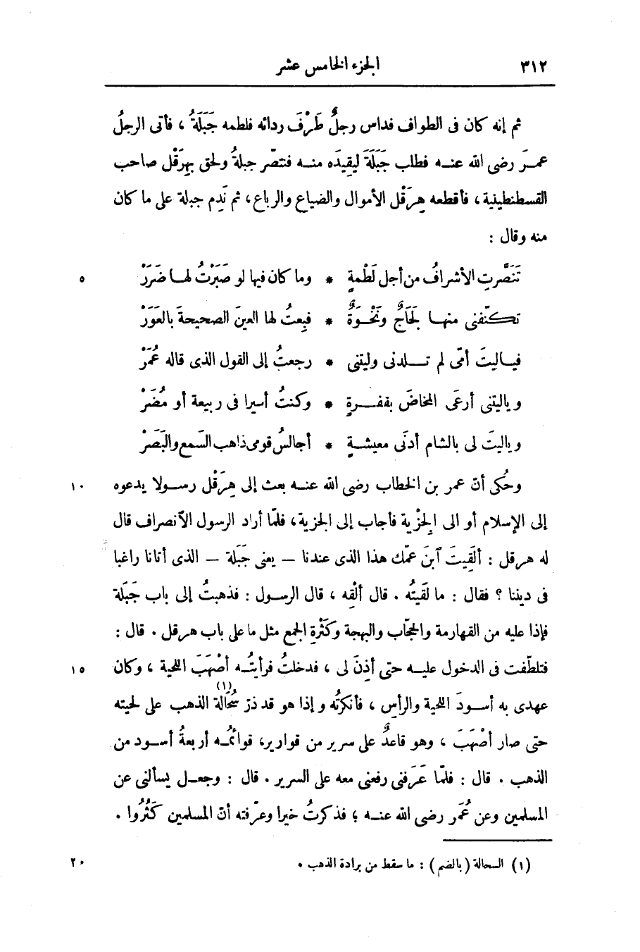 ثم إنه كان فى الطواف فداس رجل طرف ردائه فلطمه جبلة، فأتى الرجل عمر رضى الله عنه فطلب جبلة ليقيده منه فنتصّر جبلة ولحق بهرقل صاحب القسطنطينية، فأقطعه هرقل الأموال والضياع والرباع، ثم ندم جبلة على ما كان منه وقال: