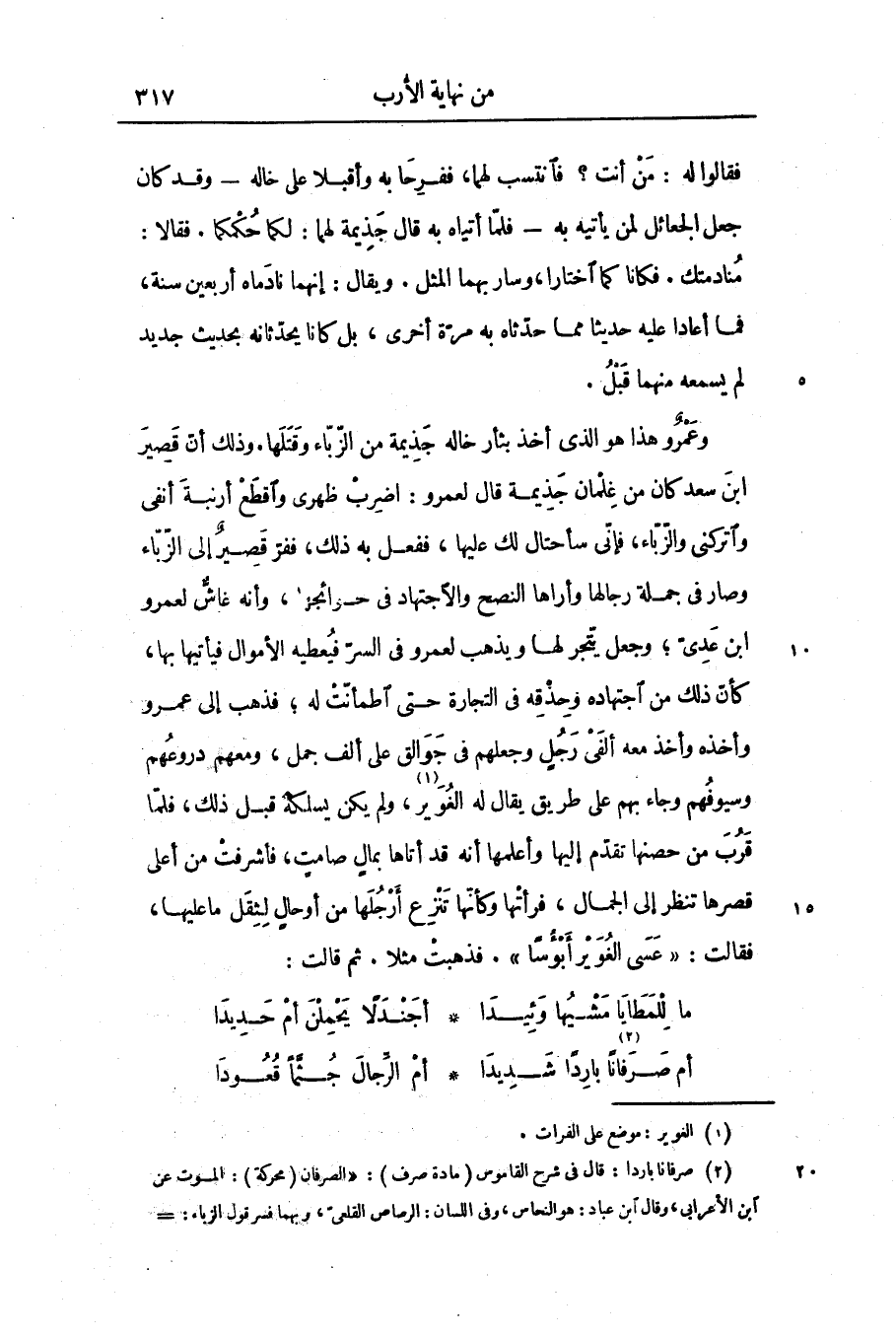 وعمرو هذا هو الذى أخذ بثأر خاله جذيمة من الزّبّاء وقتلها. وذلك أنّ قصير ابن سعد كان من غلمان جذيمة قال لعمرو: اضرب ظهرى واقطع أرنبة أنفى واتركنى والزّبّاء، فإنّى سأحتال لك عليها، ففعل به ذلك، ففرّ قصير إلى الزّبّاء وصار فى جملة رجالها وأراها النصح والاجتهاد فى حوائجها، وأنه غاشّ لعمرو ابن عدىّ؛ وجعل يتّجر لها ويذهب لعمرو فى السرّ فيعطيه الأموال فيأتيها بها، كأنّ ذلك من اجتهاده وحذقه فى التجارة حتى اطمأنّت له؛ فذهب إلى عمرو وأخذه وأخذ معه ألفى رجل وجعلهم فى جوالق على ألف جمل، ومعهم دروعهم وسيوفهم وجاء بهم على طريق يقال له الغوير «1» ، ولم يكن يسلكه قبل ذلك، فلمّا قرب من حصنها تقدّم إليها وأعلمها أنه قد أتاها بمال صامت، فأشرفت من أعلى قصرها تنظر إلى الجمال، فرأتها وكأنّها تنزع أرجلها من أوحال لثقل ما عليها، فقالت: «عسى الغوير أبؤسا» . فذهبت مثلا. ثم قالت: