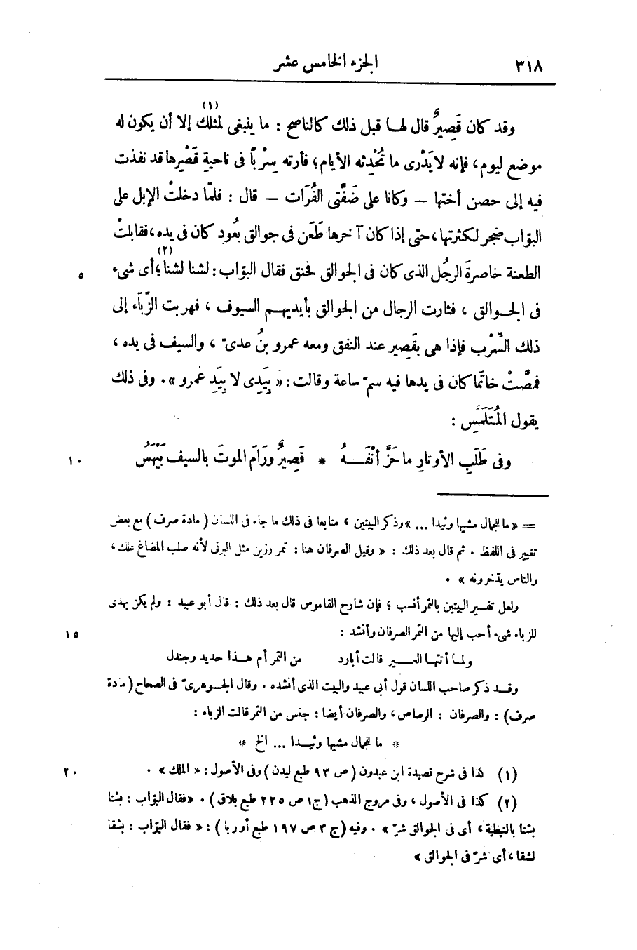 وقد كان قصير قال لها قبل ذلك كالناصح: ما ينبغى لمثلك «1» إلا أن يكون له موضع ليوم، فإنه لا يدرى ما تحدثه الأيام؛ فأرته سربا فى ناحية قصرها قد نفذت فيه إلى حصن أختها- وكانا على ضفّتى الفرات- قال: فلمّا دخلت الإبل على البوّاب ضجر لكثرتها، حتى إذا كان آخرها طعن فى جوالق بعود كان فى يده، فقابلت الطعنة خاصرة الرجل الذى كان فى الجوالق فحنق فقال البوّاب: لشنا لشنا «2» ؛ أى شىء فى الجوالق، فثارت الرجال من الجوالق بأيديهم السيوف، فهربت الزّبّاء إلى ذلك السّرب فإذا هى بقصير عند النفق ومعه عمرو بن عدىّ، والسيف فى يده، فمصّت خاتما كان فى يدها فيه سمّ ساعة وقالت: «بيدى لا بيد عمرو» . وفى ذلك يقول المتلمس: