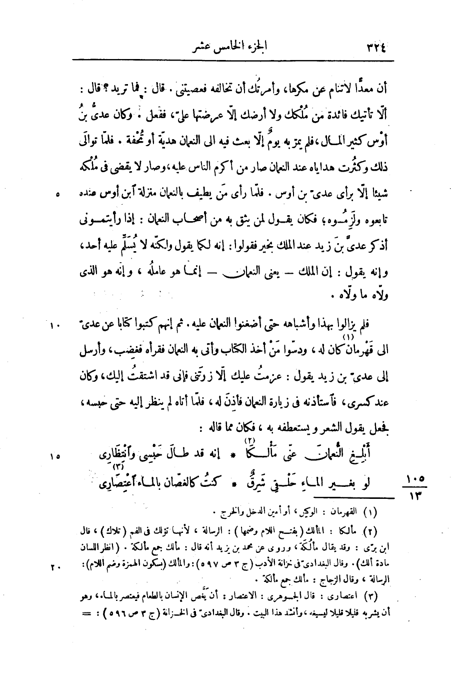ألّا تأتيك فائدة من ملكك ولا أرضك إلّا عرضتها علىّ، ففعل. وكان عدىّ بن أوس كثير المال، فلم يمرّ به يوم إلّا بعث فيه الى النعمان هديّة أو تحفة. فلمّا توالى ذلك وكثرت هداياه عند النعمان صار من أكرم الناس عليه، وصار لا يقضى فى ملكه شيئا إلّا برأى عدىّ بن أوس. فلمّا رأى من يطيف بالنعمان منزلة ابن أوس عنده تابعوه ولزموه؛ فكان يقول لمن يثق به من أصحاب النعمان: إذا رأيتمونى أذكر عدىّ بن زيد عند الملك بخير فقولوا: إنه لكما يقول ولكنّه لا يسلّم عليه أحد، وإنه يقول: إن الملك- يعنى النعمان- إنما هو عامله، وإنه هو الذى ولّاه ما ولّاه.