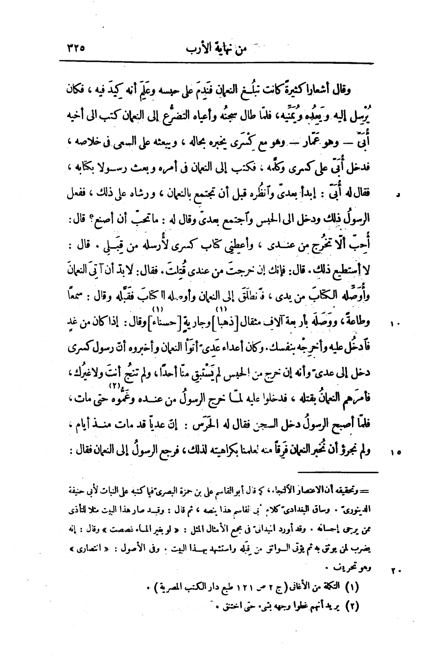 لا أستطيع ذلك. قال: فإنك إن خرجت من عندى قتلت. فقال: لا بدّ أن آتى النعمان وأوصّله الكتاب من يدى، فانطلق إلى النعمان وأوصله الكتاب فقبّله وقال: سمعا وطاعة، ووصله بأربعة آلاف مثقال [ذهبا «1» ] وجارية [حسناء «2» ] وقال: إذا كان من غد فادخل عليه وأخرجه بنفسك. وكان أعداء عدىّ أتوا النعمان وأخبروه أنّ رسول كسرى دخل إلى عدىّ وأنه إن خرج من الحبس لم يستبق منّا أحدا، ولم تنج أنت ولا غيرك، فأمرهم النعمان بقتله، فدخلوا عليه لمّا خرج الرسول من عنده وغمّوه «3» حتى مات، فلمّا أصبح الرسول دخل السجن فقال له الحرس: إنّ عديّا قد مات منذ أيام، ولم نجرؤ أن نخبر النعمان فرقا منه لعلمنا بكراهيته لذلك، فرجع الرسول إلى النعمان فقال: