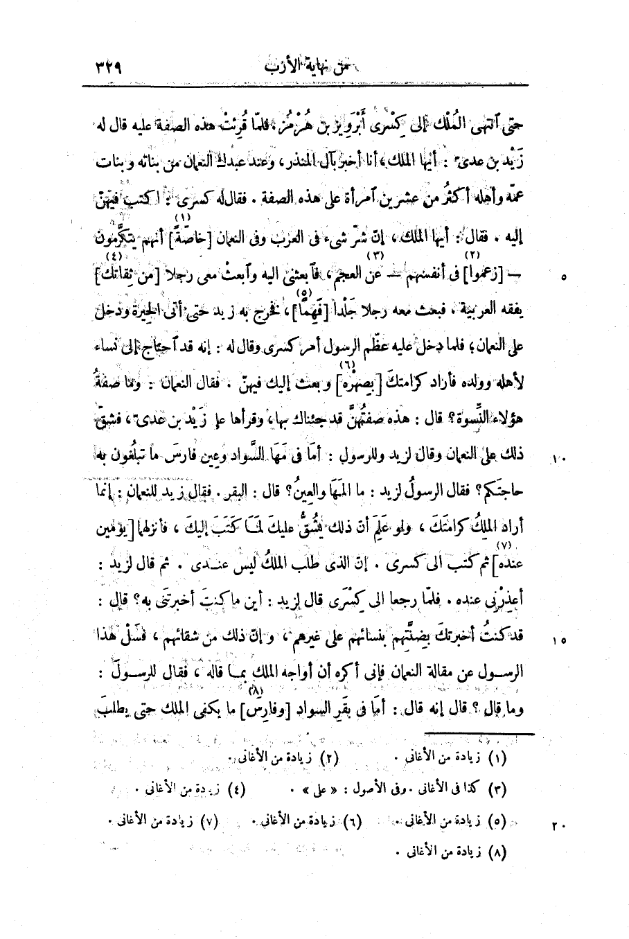 حتى انتهى الملك إلى كسرى أبرويز بن هرمز. فلمّا قرئت هذه الصفة عليه قال له زيد بن عدىّ: أيها الملك، أنا أخبر بآل المنذر، وعند عبدك النعمان من بناته وبنات عمّه وأهله أكثر من عشرين امرأة على هذه الصفة. فقال له كسرى: اكتب فيهنّ إليه. فقال: أيها الملك، إنّ شرّ شىء فى العرب وفى النعمان [خاصّة «1» ] أنهم يتكرّمون-[زعموا «2» ] فى أنفسهم- عن «3» العجم، فابعثنى اليه وابعث معى رجلا [من ثقاتك «4» ] يفقه العربية. فبعث معه رجلا جلدا [فهما «5» ] ، فخرج به زيد حتى أتى الحيرة ودخل على النعمان؛ فلما دخل عليه عظّم الرسول أمر كسرى وقال له: إنه قد احتاج إلى نساء لأهله وولده فأراد كرامتك [بصهره «6» ] وبعث إليك فيهنّ. فقال النعمان: وما صفة هؤلاء النّسوة؟ قال: هذه صفتهنّ قد جئناك بها، وقرأها على زيد بن عدىّ، فشقّ ذلك على النعمان وقال لزيد وللرسول: أما فى مها السّواد وعين فارس ما تبلغون به حاجتكم؟ فقال الرسول لزيد: ما المها والعين؟ قال: البقر. فقال زيد للنعمان: إنما أراد الملك كرامتك، ولو علم أنّ ذلك يشقّ عليك لما كتب إليك، فأنزلهما [يومين عنده «7» ] ثم كتب الى كسرى. إنّ الذى طلب الملك ليس عندى. ثم قال لزيد: